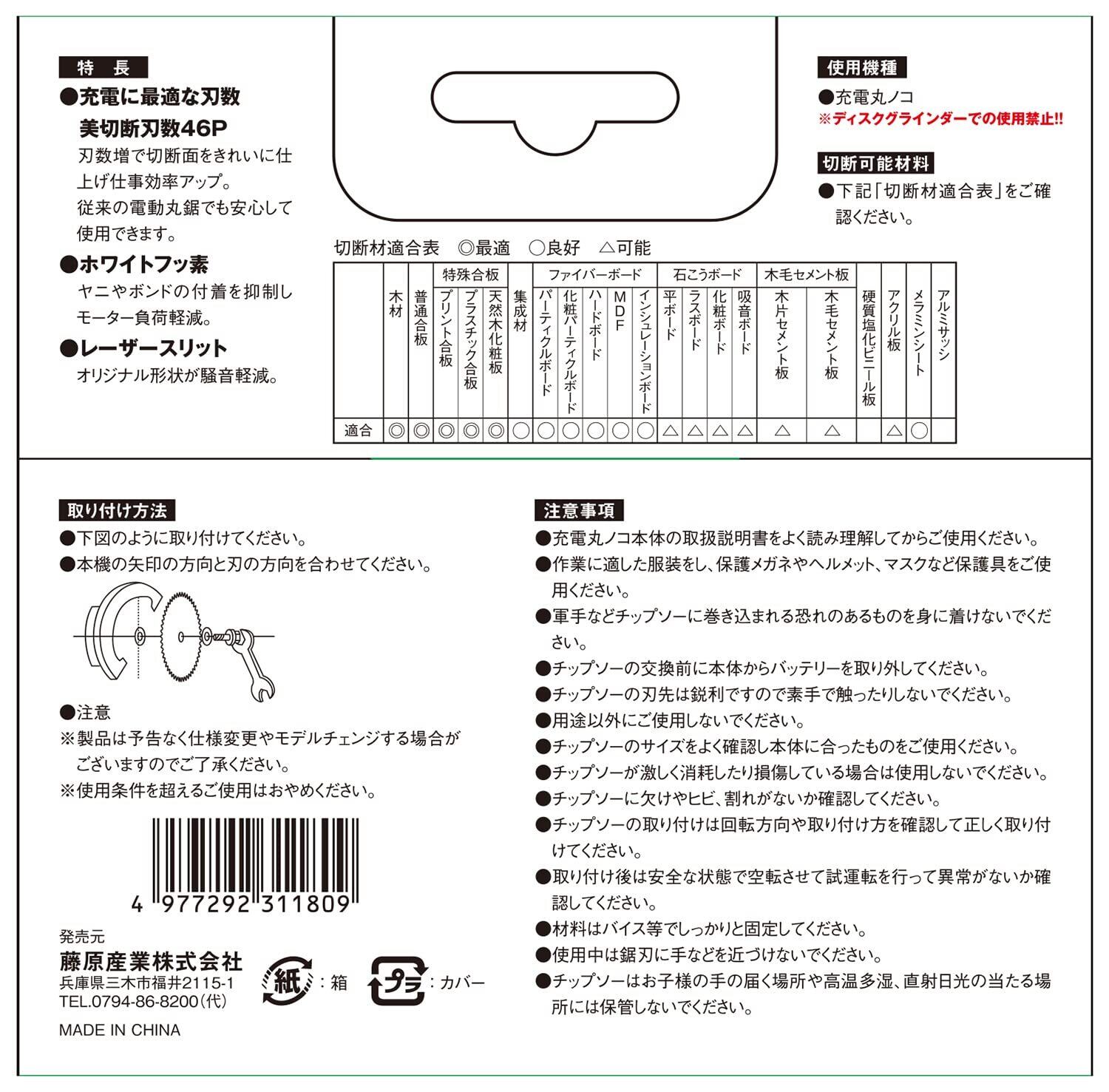 用途:充電丸鋸や電動丸鋸に取り付けて木材、合板、集成材などの切断作業