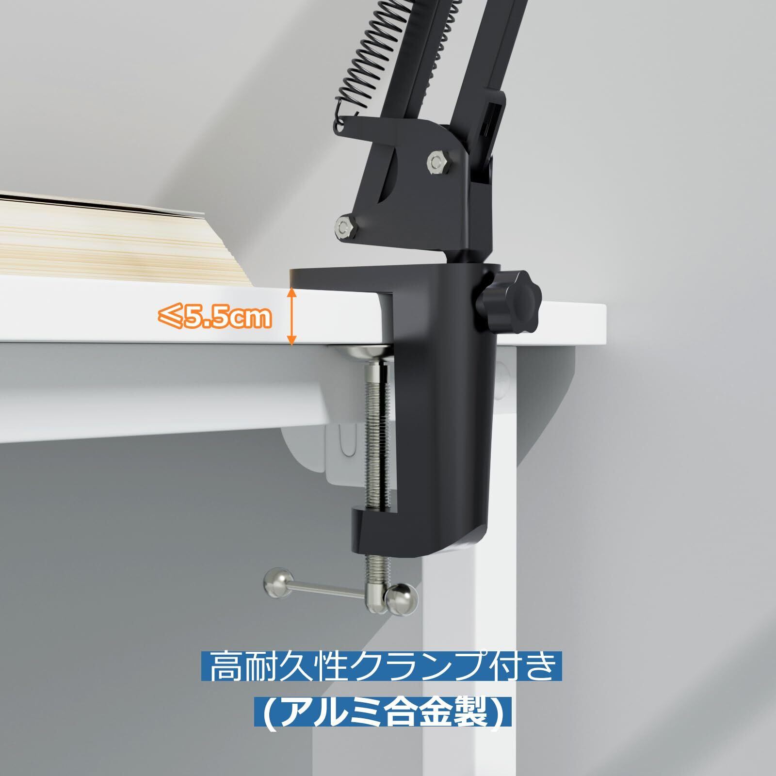 【頑丈な金属クランプで省スペース設計】本体だけでなく、重要なクランプ部分も耐久性のあるアルミ合金製を採用。厚さ5.5cm以下のあらゆる場所にしっかりと固定できる設計で、角度調整も安定しています。取り付けは非常に簡単で、工具は一切不要。クランプ設計により、デスク上の省スペース化に貢献します。