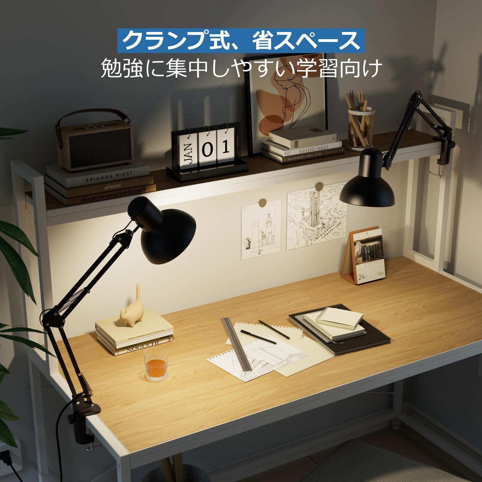 【目に優しく、勉強や作業などに最適】LEDデスクライトの内面が白色塗装されたランプシェードは、光を効率よく反射し、自然光に近い柔らかな光を生み出します。長時間の作業でも目が疲れにくく、お子様から大人まで目に優しい卓上照明です。