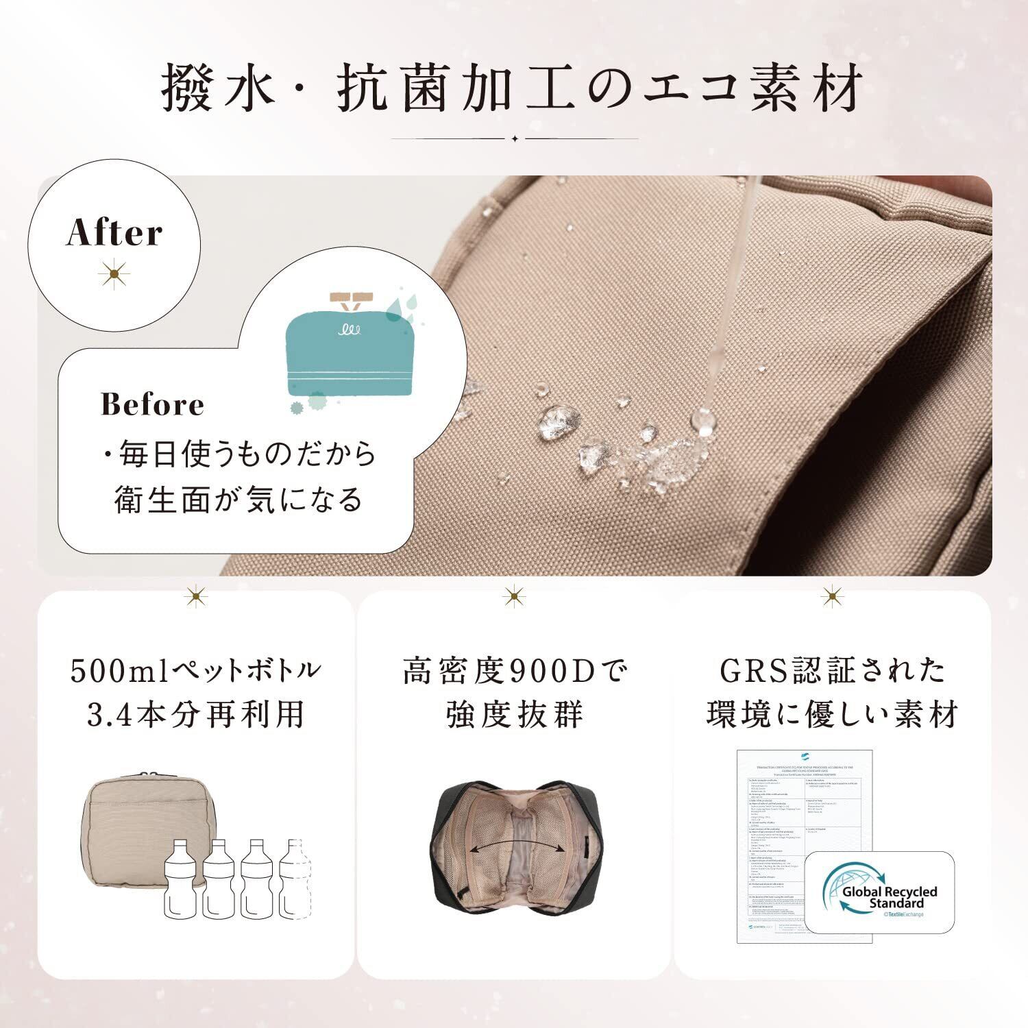 【手洗いできる高機能エコ素材】500ml3,4本分のペットボトルを再利用したリサイクルポリエステル素材を使用。環境にやさしくさらに撥水・抗菌加工を施して水にもつよく普段使いにピッタリです。 また手洗い可能で清潔に保ちます。