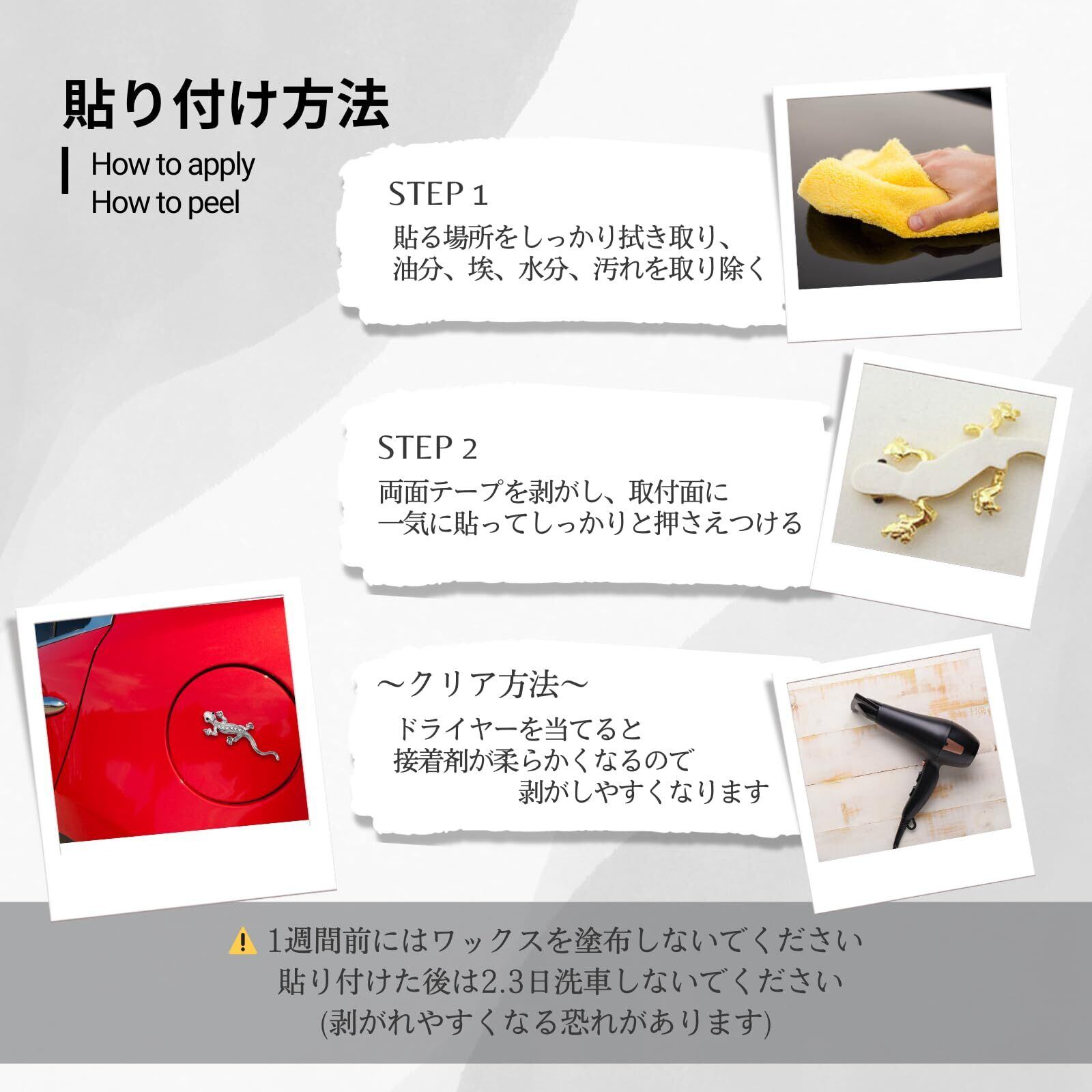 【 注意点 】 ①貼り付ける部分は平らな場所にしてください。 ②剥がれてくるかもしれないので、しっかりと抑えて貼り付けてください。 ③貼り付ける前に必ず乾燥させてください。