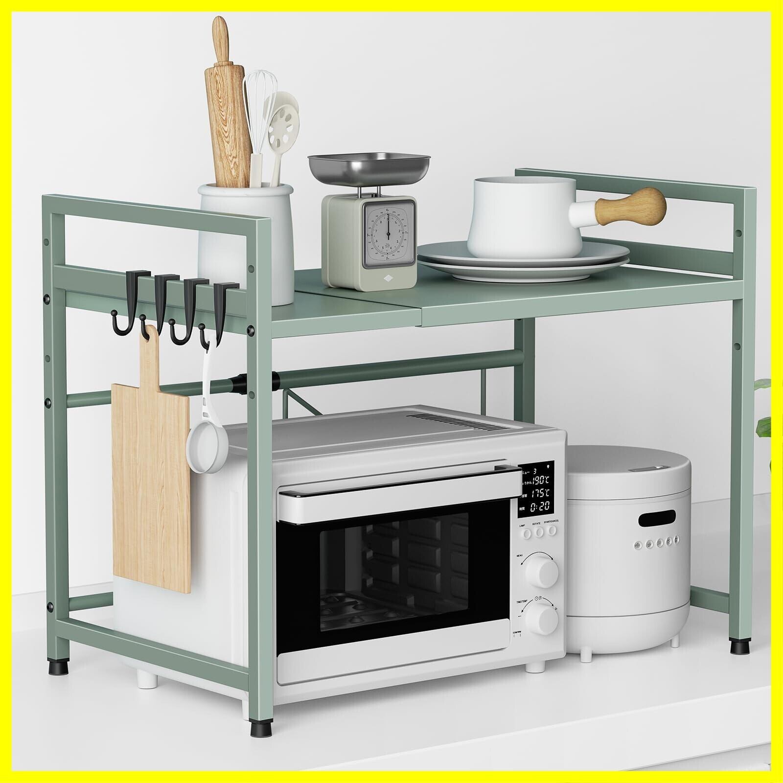 TKUIN レンジ上ラック キッチン 伸縮式 トースターラック 幅(39-65cm) 伸縮可 オーブンレンジラック 棚板高さ調節可 電子レンジ 台 収納 耐荷重50kg フック4つ付き 組み立て簡単 おしゃれ (グリーン)