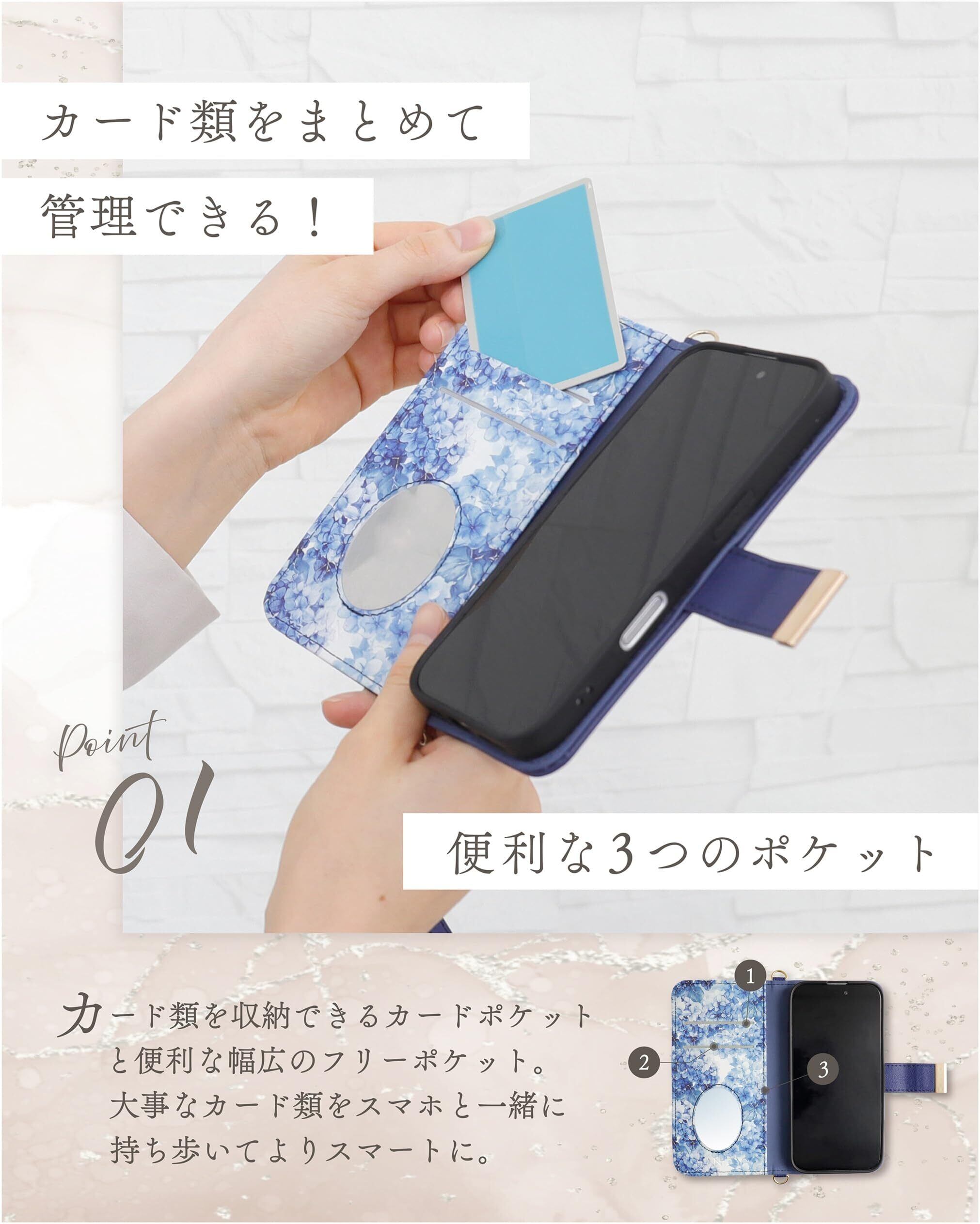 【キャッシュレスに便利な機能性】カードを収納できるポケット付き。上下どちらにも付けられるハンドストラップはケースとおそろい。