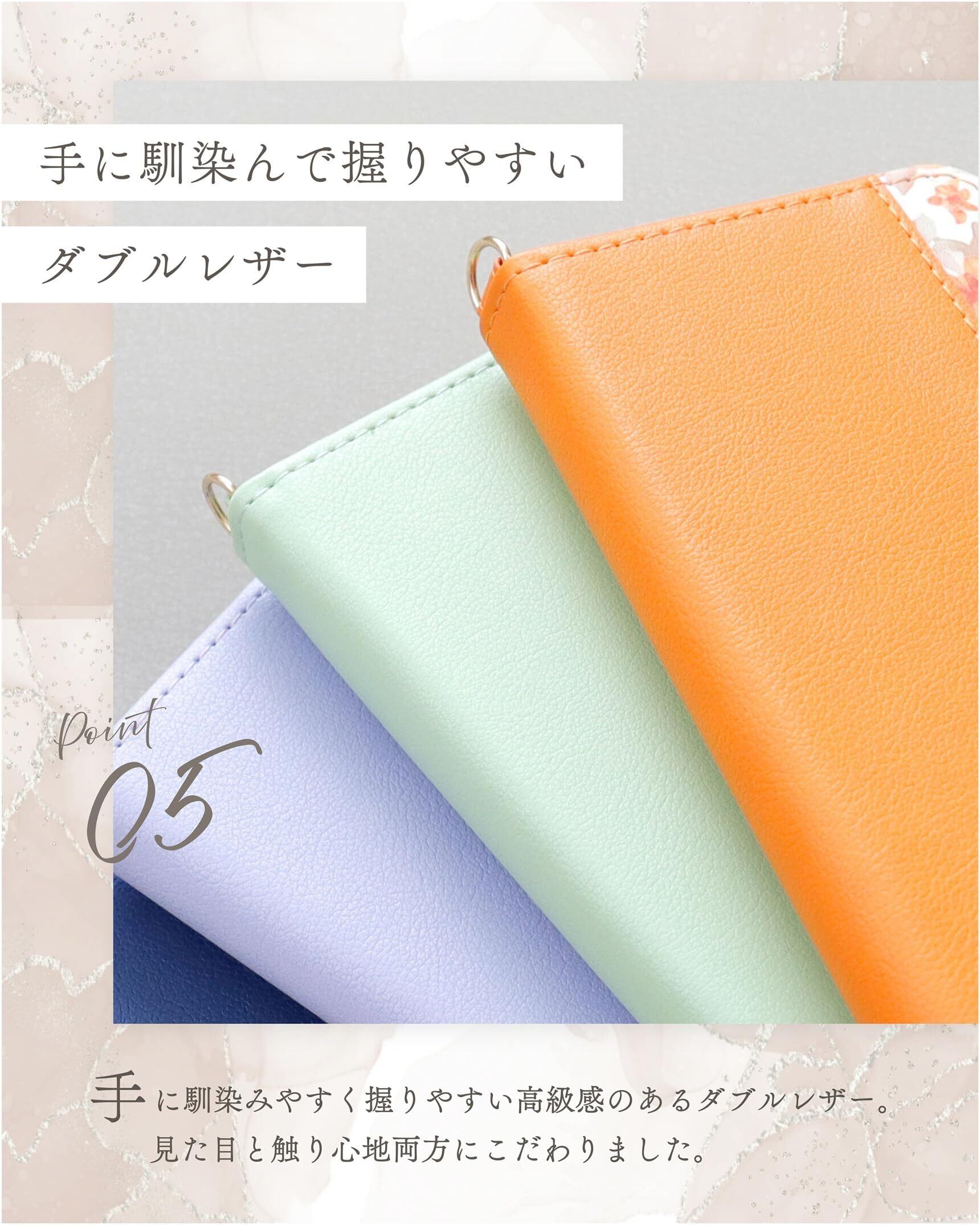 【その他仕様】ハンドストラップ取り外し可/カードケース2・フリー収納1/スタンド機能/装着時カメラ撮影可(※超広角カメラで撮影した際にケースの一部が写り込む可能性がございます)/タッチ決済可/アクションボタン保護/Dカン2個【材質】(外側) PU / (内側) TPU