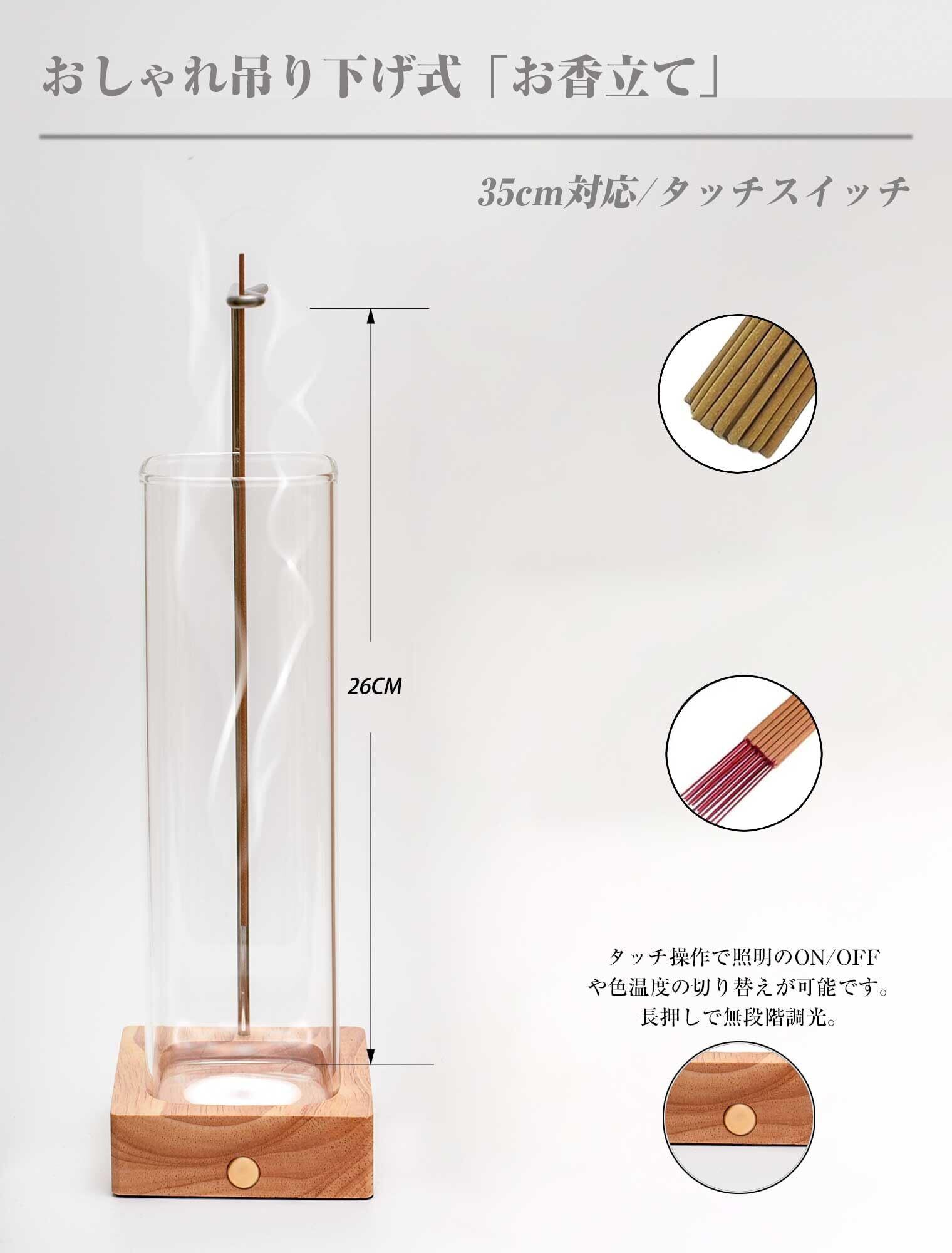 お香立て おしゃれ 線香立て 灰がこぼれない 香炉 LEDライト付き(3色調光) ガラス製 吊り下げ式 天然木ベース 癒し インテリア 書斎 寝室 (ナチュラル+正方形)