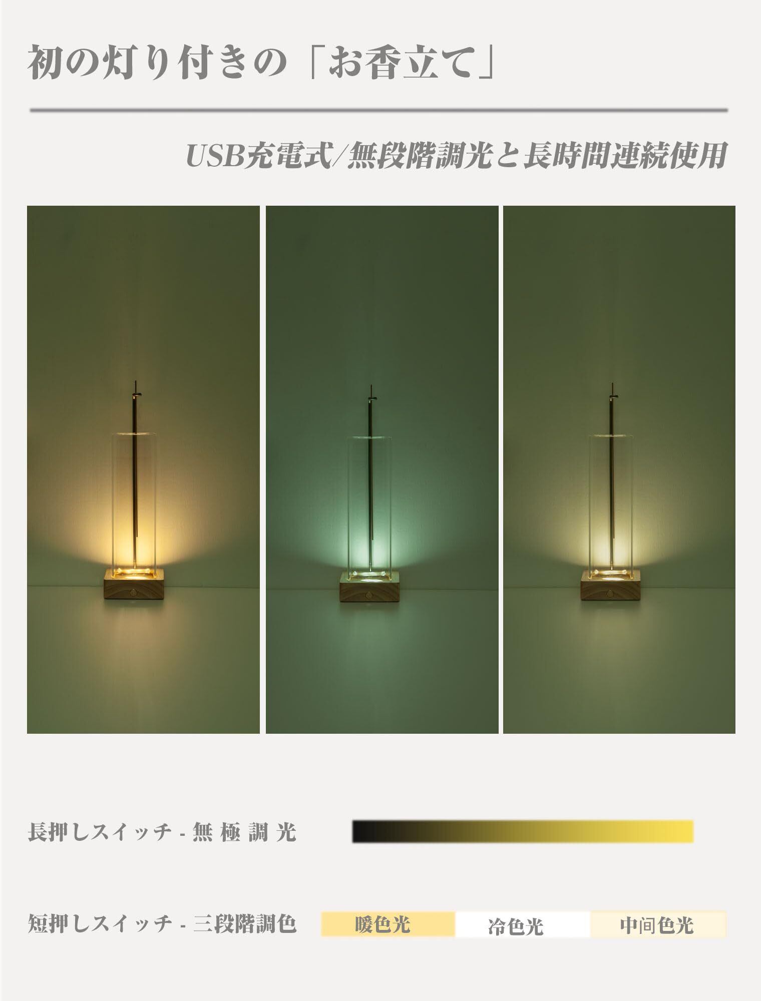 【無段階調光と長時間連続使用】お香立てのベースには、無音タッチスイッチが付いており、短いタッチで光の色温度を選択し、長押しで明るさを無段階調整できます。最低明るさ設定で充電後、最長72時間連続発光できます。気分や環境に合わせて、適切な光や明るさを選んで雰囲気を演出できます。