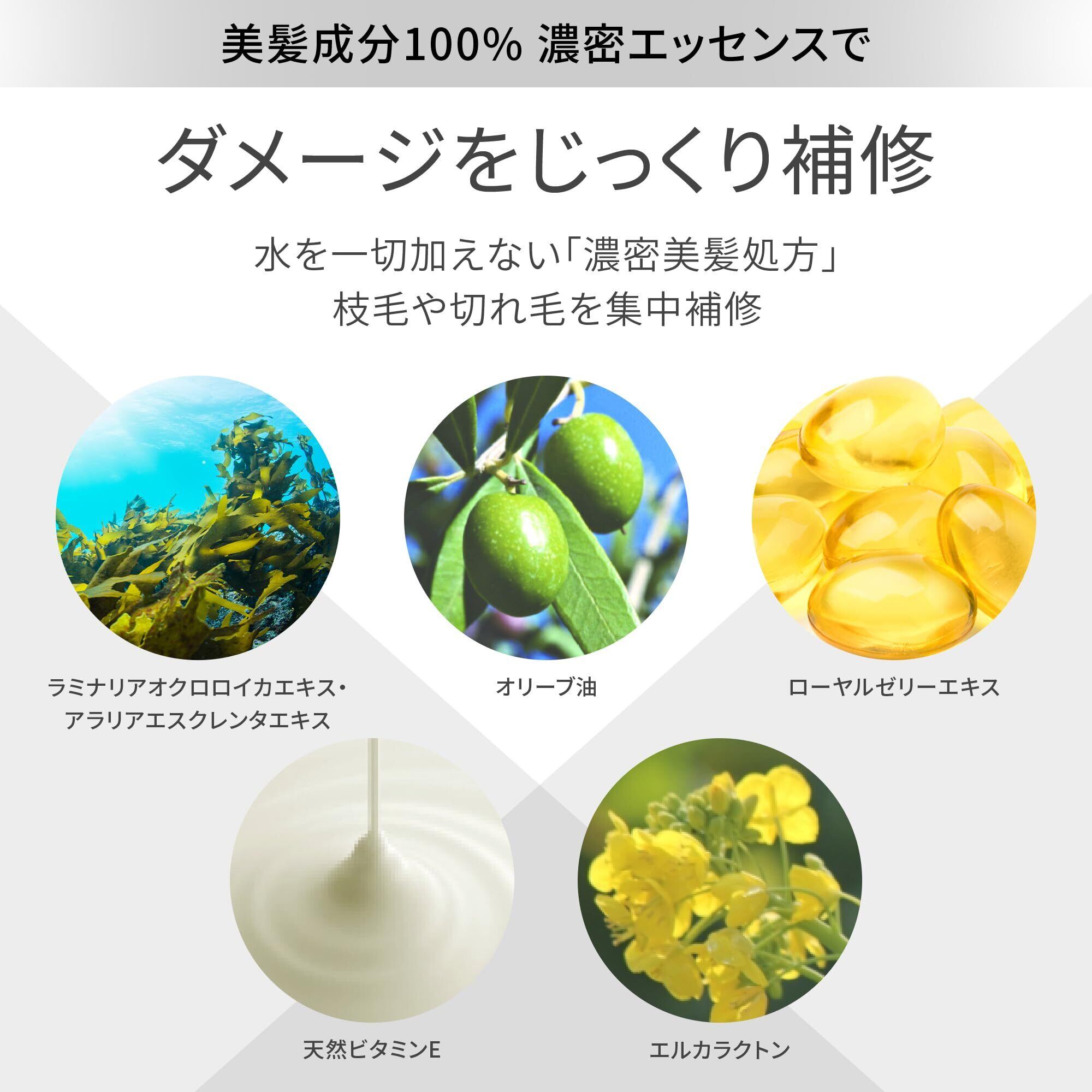 【濃密美髪エッセンス】水を一切加えず、美髪成分のみで構成されたヘアエッセンス。潤いや美髪成分を髪内部にしっかり閉じ込め、キューティクルを集中的に補修します。