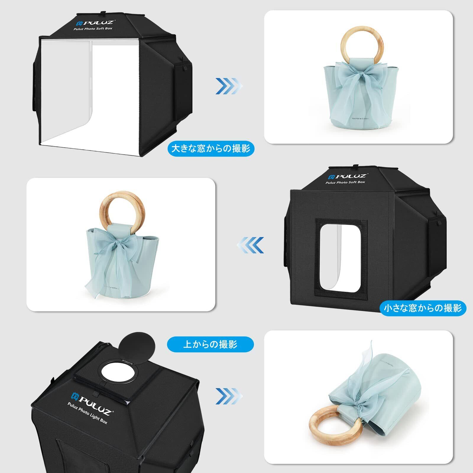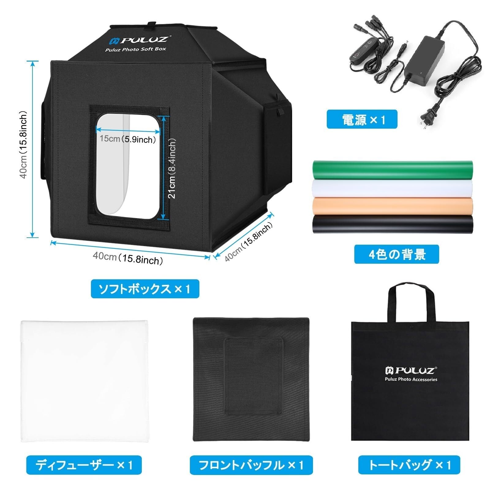 PULUZ 撮影ボックス 40cm折りたたみ式撮影ブース 物撮り用ボックス 簡易スタジオ ソフトボックス 480PCSランプビーズ 5500K 無段階調光 4色PVC背景&ディフューザー付き 卓上写真スタジオ 携帯便利/組立簡単/収納便利 自宅商品撮影 卓上撮影キット (40cm)