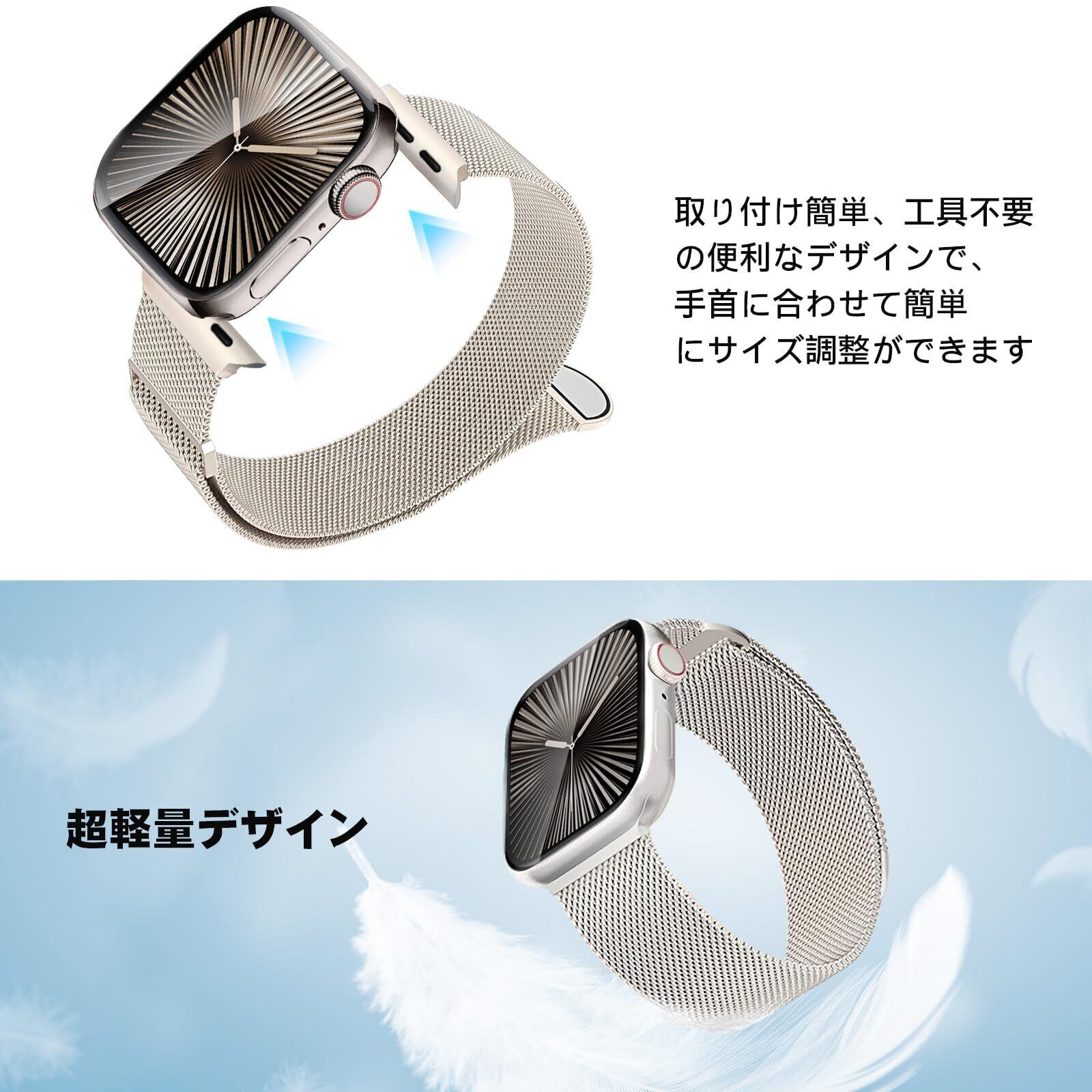 CAERMA コンパチブル アップルウォッチ バンド 38mm 40mm 41mm 42mm 44mm 45mm 46mm 49mm コンパチブル Apple Watch バンド ステンレス留め金製 男女兼用 長さ調節 強力な磁 通気 メッシュ ベルト コンパチブル Apple Watch Series 11/10/9/8/7/6/5/4/3/2/1/SE/Ultra 対応(49/46/45/44/42mm(Series 3), スターライト)