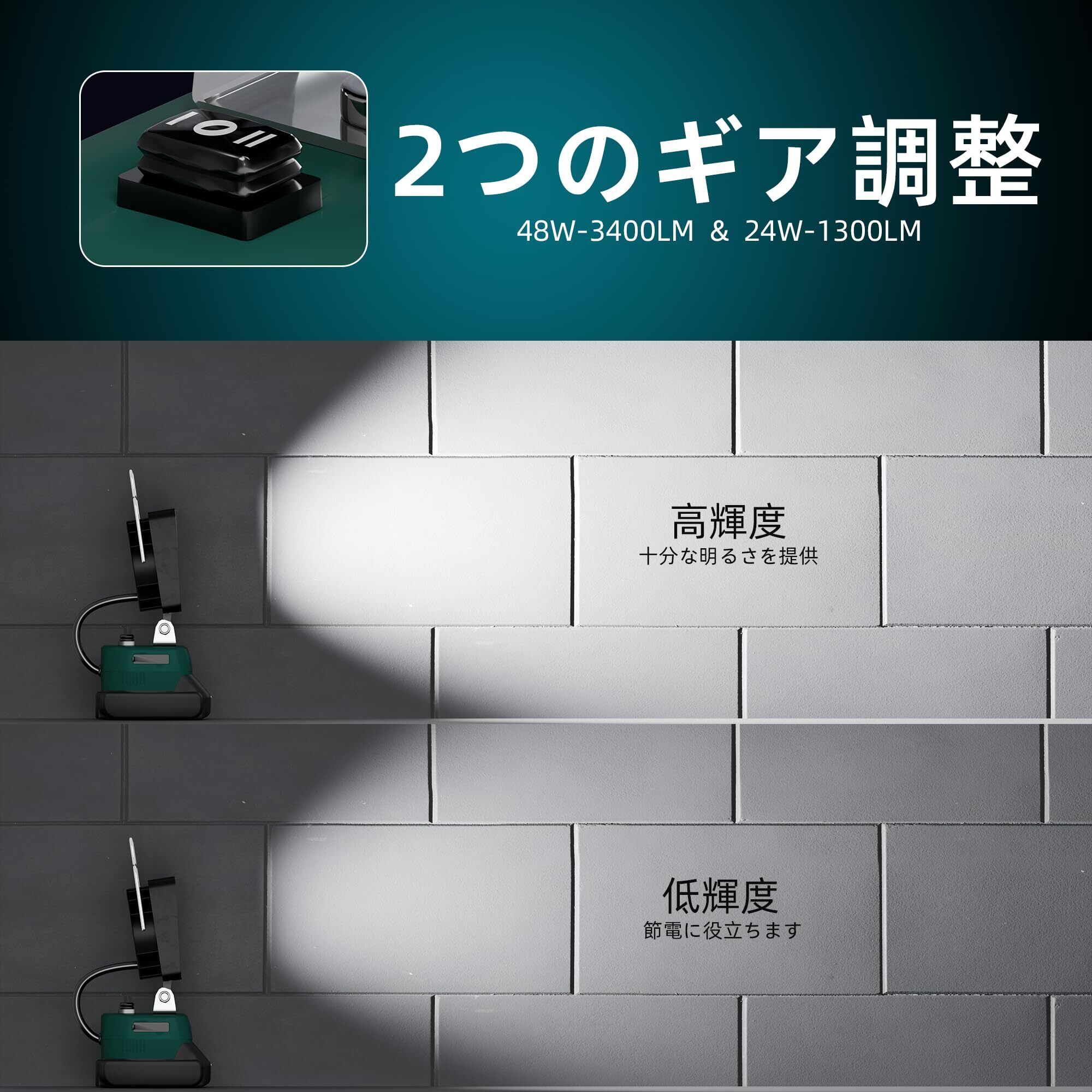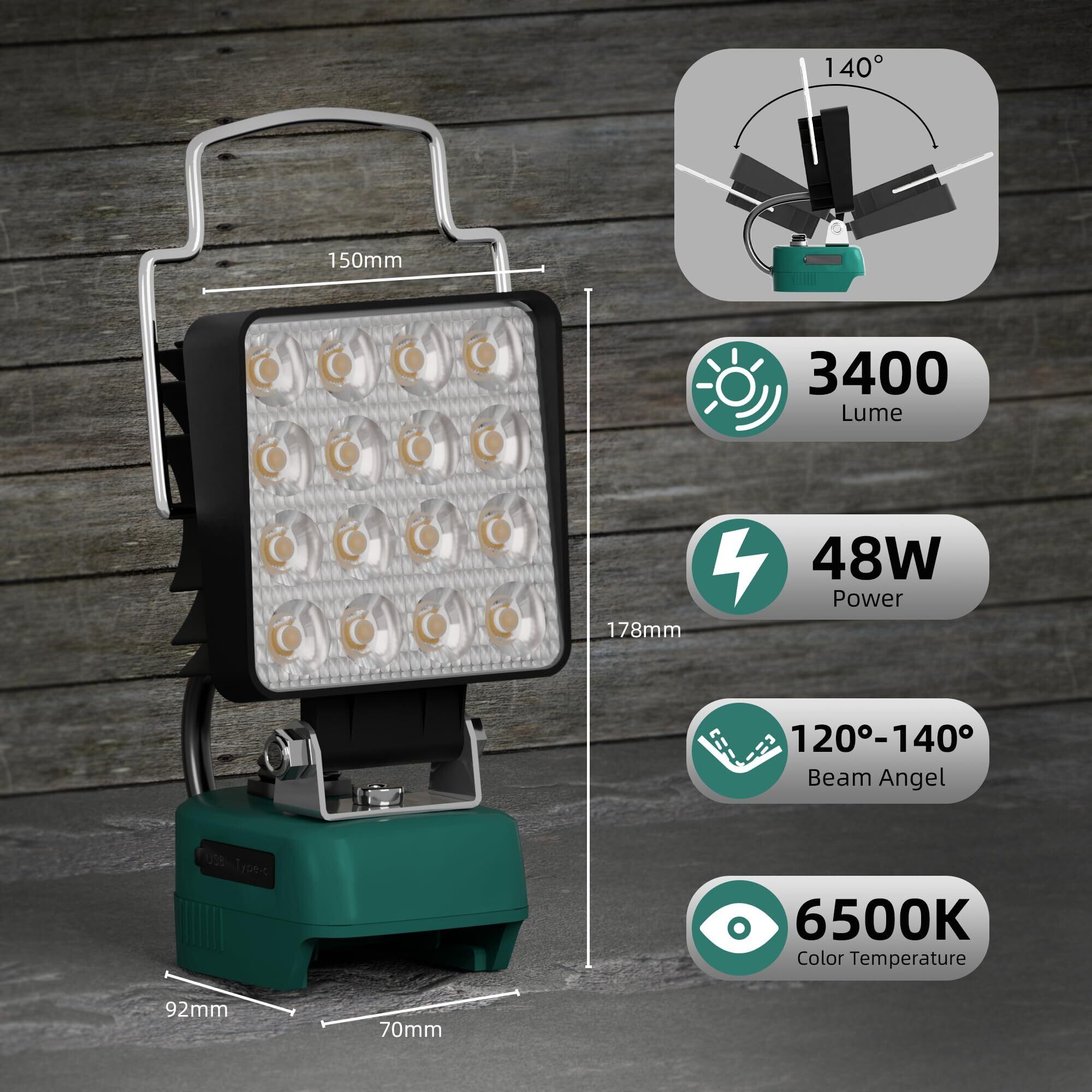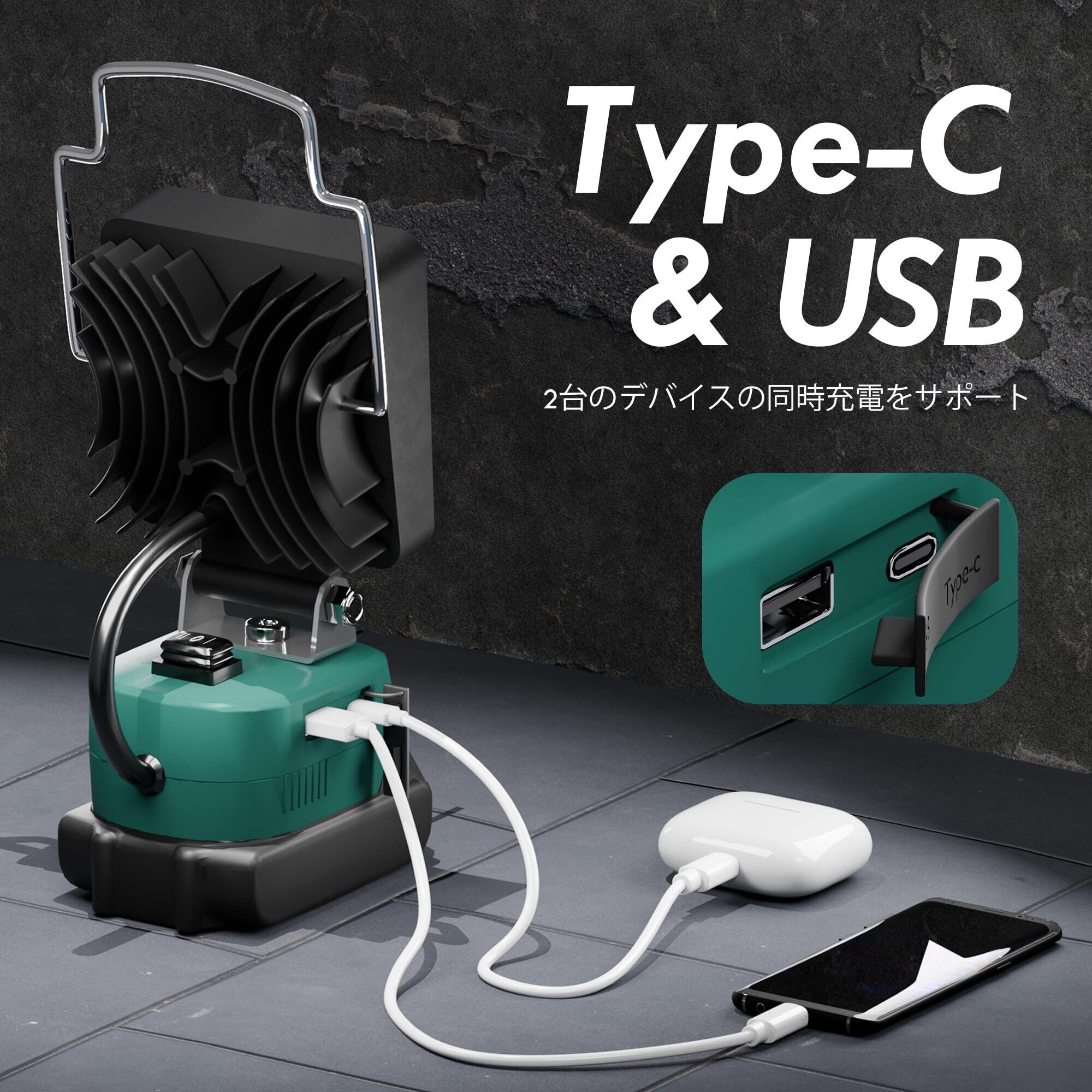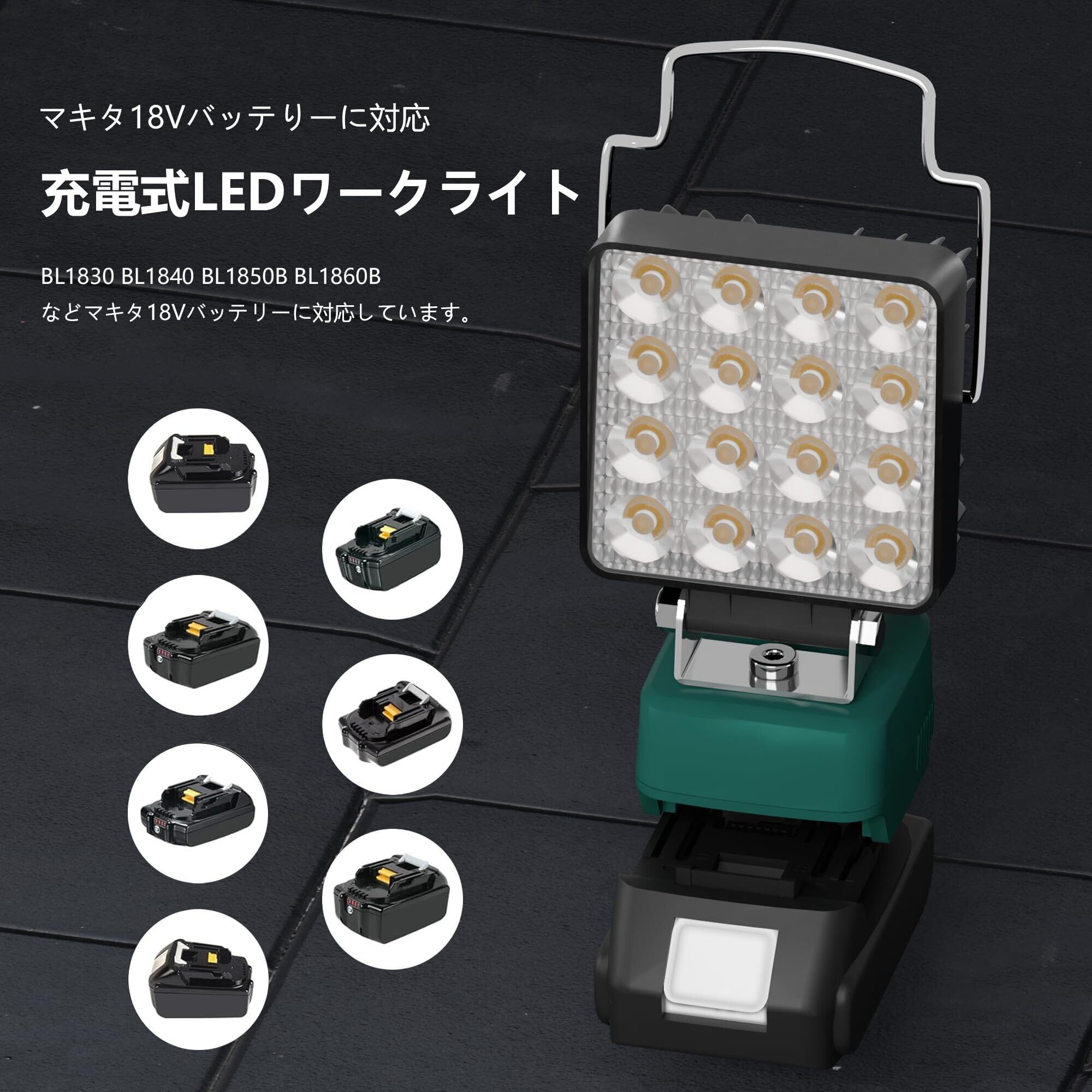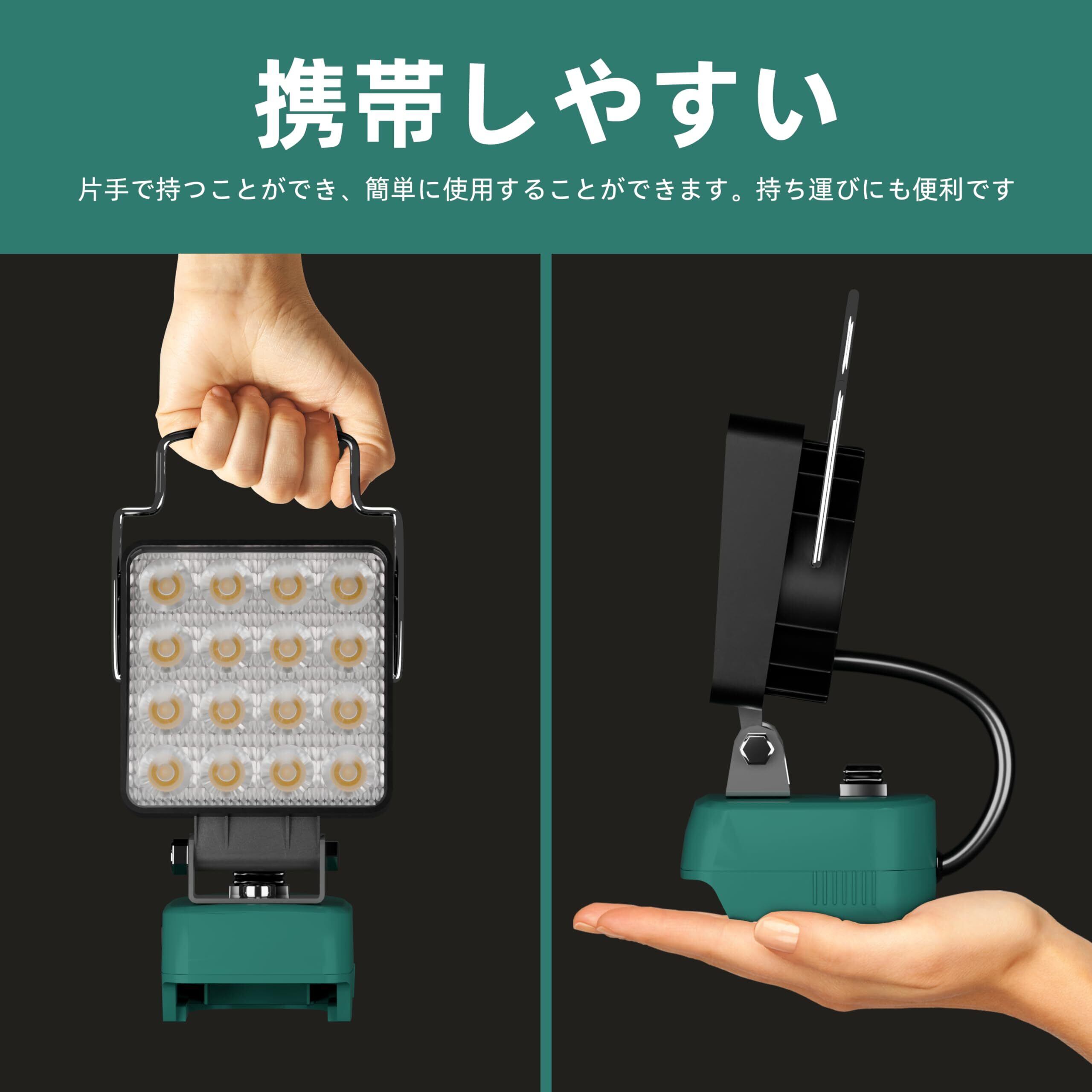 マキタ ライト18Vバッテリー互換 充電式 ワークライト LED フラッドライト コードレス作業灯 LED投光器手提げ付 スマホ充電 USB充電 Type-C充電 超高輝 携帯型 工事現場/非常用照明/屋外作業/キャンプ/登山/夜釣り/防災/停電に最適 軽量