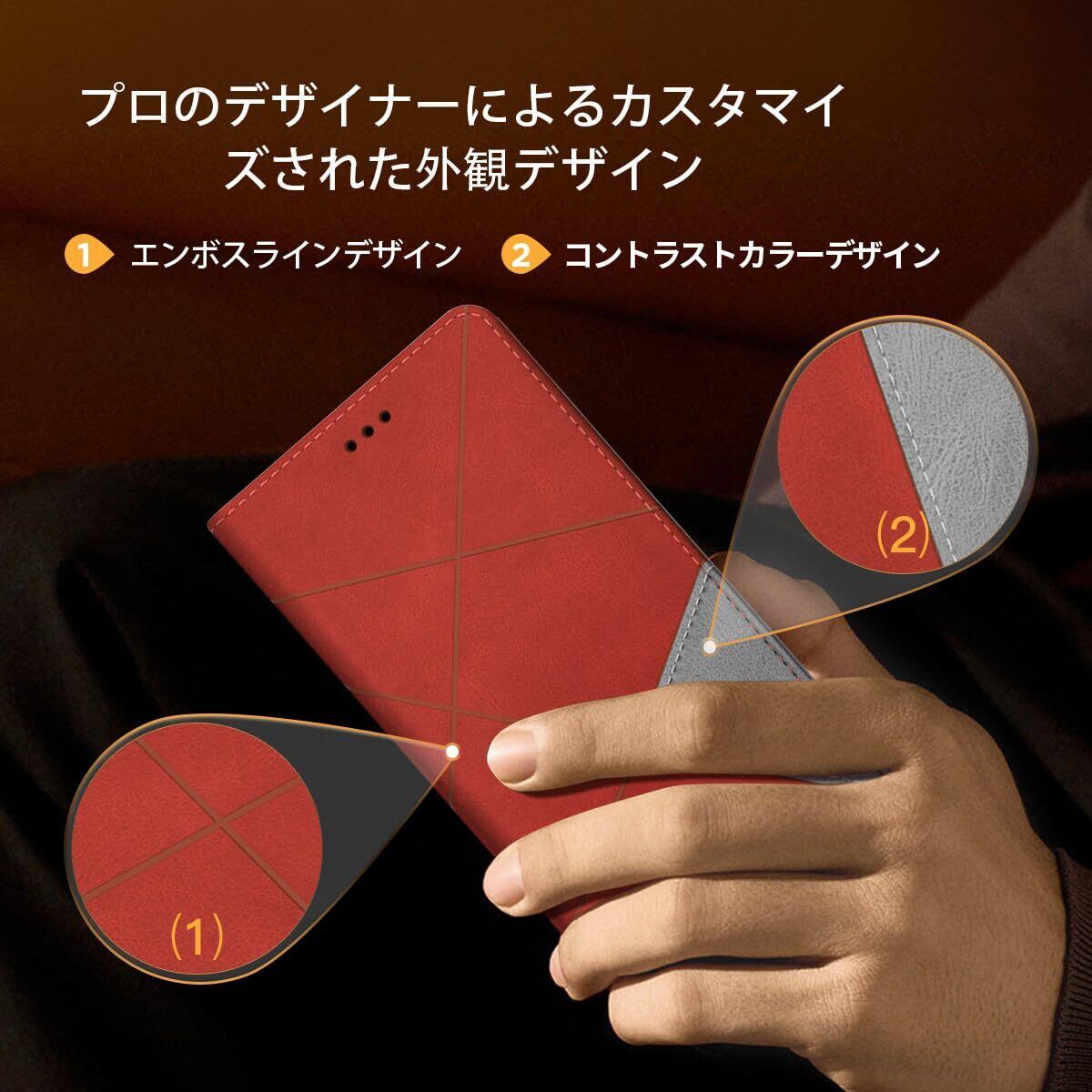【プロのデザイナーによるデザイン】fagazzfuのデザイナーは常にシンプルでファッショナブルなデザインコンセプトを貫いています。シンプルなコールドプレスラインのデザインは、革をより立体的かつ触感的にすることができ。三角形のコントラストカラーデザインで単調にならず、メインカラーと干渉しません。シンプルなデザインで、誰もが異なるファッションと美しさの感覚をもたらします。ストラップホールも付いておりますので、お好みの装飾に合わせてご利用いただけます。組み合わせて自分だけのスマホケースを作りましょう。
