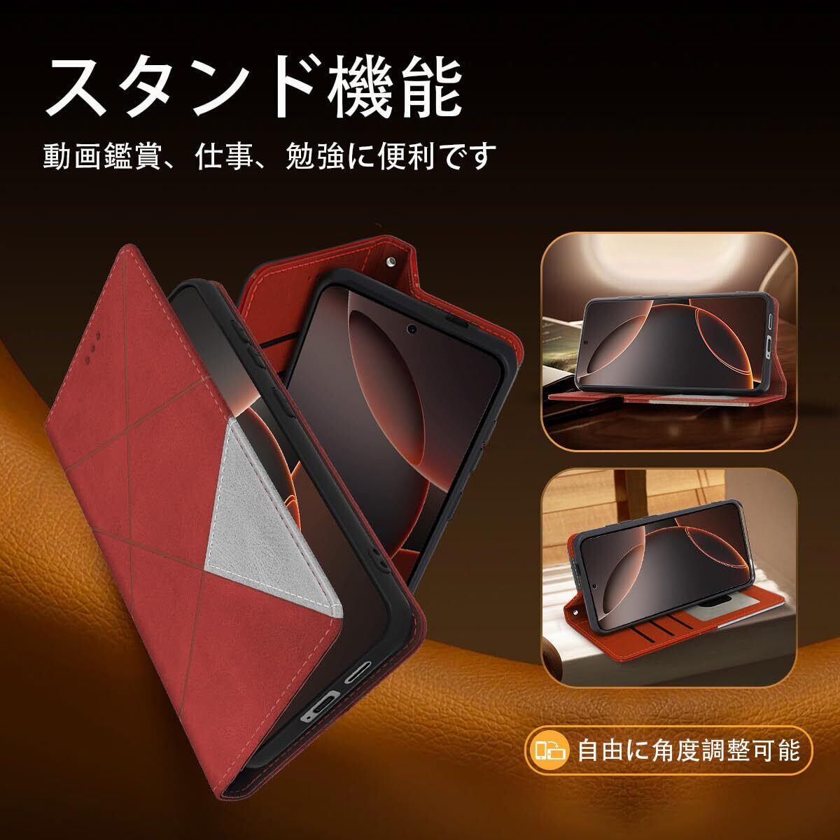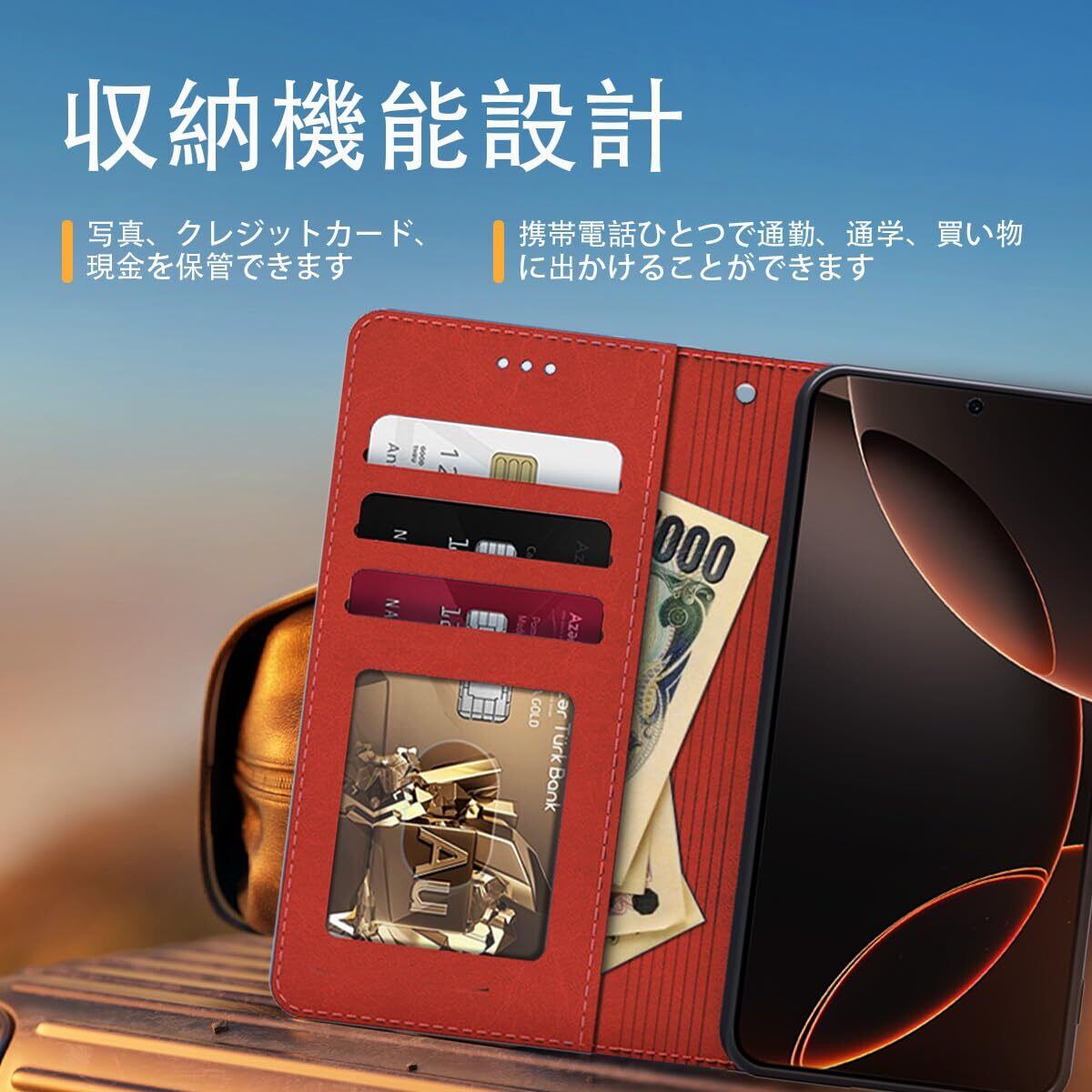 【収納機能、横置きスタンド機能デザイン】スタンド機能が付いて,横向いて斜めに立てて,お好きな角度を調整できます、動画鑑賞や読書なども楽しめます。内側に実用性のカード入れポケット×3、内側ポケット×1、カード類、現金、名刺、免許証入れなどを収納でき、通勤、通学、旅行に便利です。マグネットが内蔵されているので、ベルトがなくてもフタがぴったり閉まります。外出するときはいつも携帯電話を持ち歩くだけです。