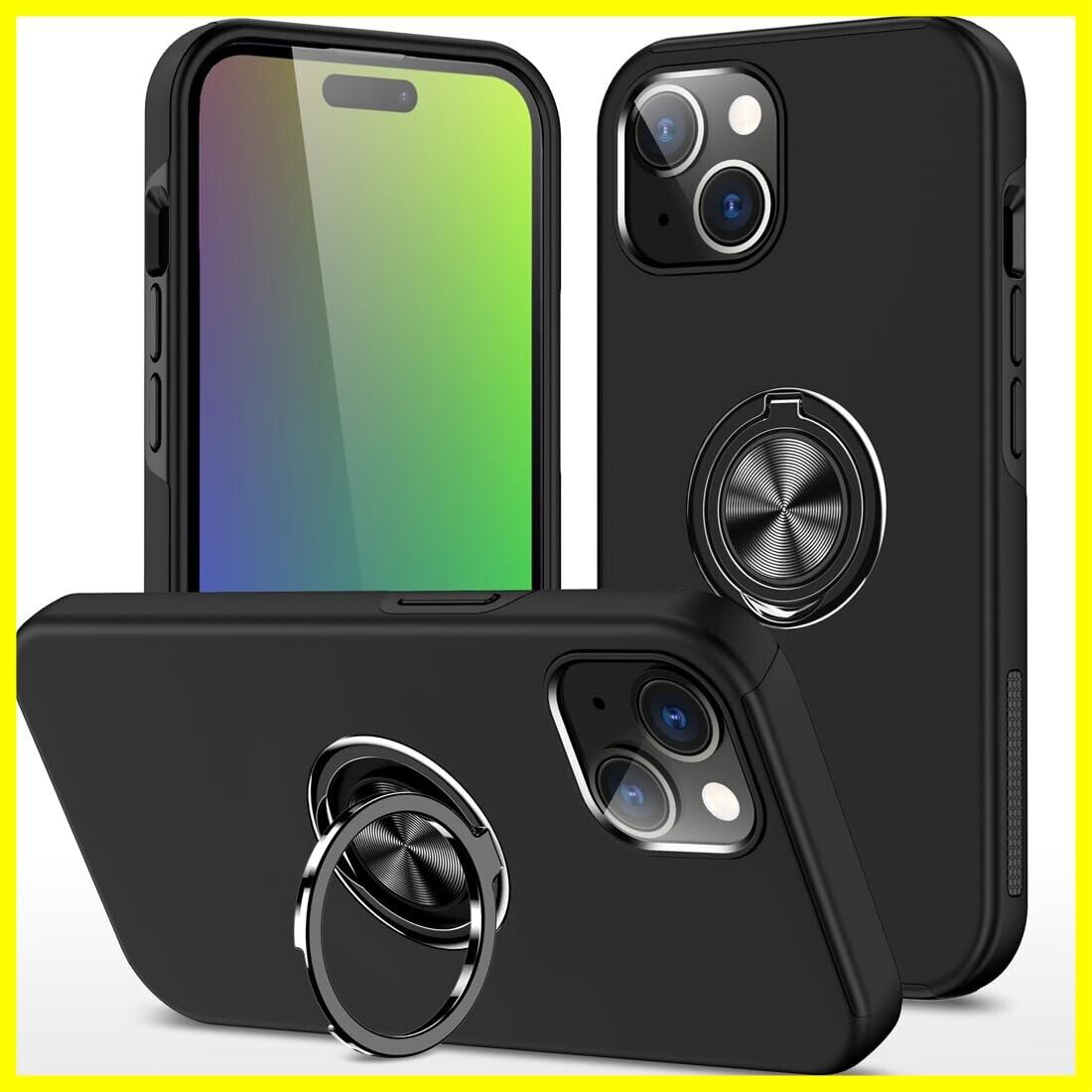 iPhone 15 用 ケース リング付き 耐衝撃 TPU 二重構造 アイフォン15 カバー リング Uovon スマホケース あいほん15 リングつき スタンド機能 車載ホルダー対応 擦り傷防止 落下防止 おしゃれ · ブラック