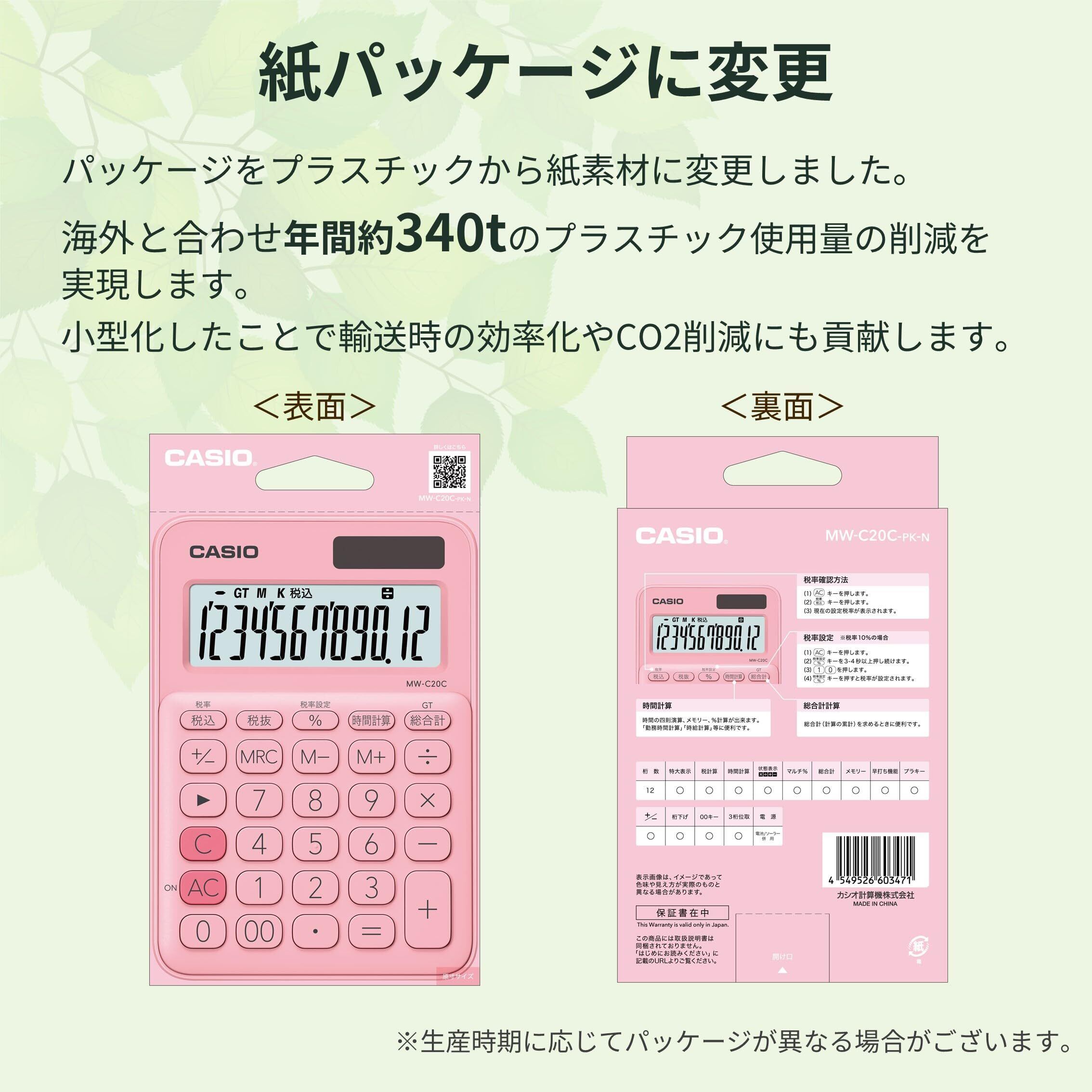 カシオ カラフル電卓 ペールピンク 12桁 ミニジャストタイプ MW-C20C-PK-N