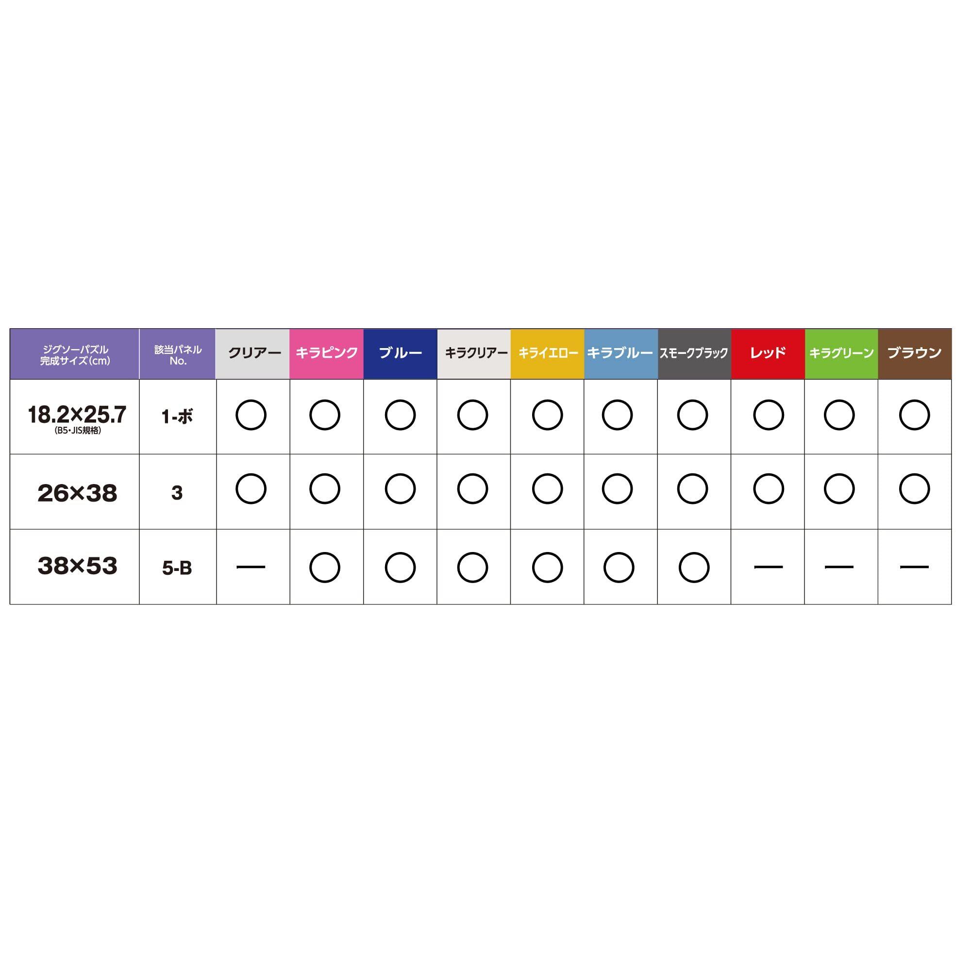 適合パズルサイズ 18.2×25.7cm パネル番号 1-ボ カラフルでポップ! ジグソーパズルを可愛く演出します。 お買い求めやすいお値段も魅力! キラクリアーはキラキラと輝くラメがよりクリスタル感を強調し絵柄に爽やかさを演出します。 専用スタンド付き