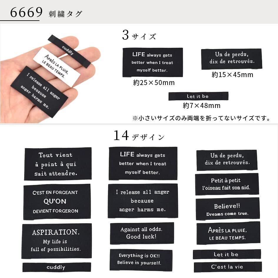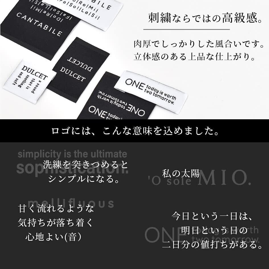 ・在庫の状況で一部内容が変わる場合がございます。・セット済み商品のため、中身の変更を承ることはできません。・ロットにより細いタグに折り目がついていない場合がございます。その場合はアイロンで折り目をつけていただきますようお願い申し上げます。・白のタグは黒のタグよりも柔らかい仕上がりとなっております。シワやヨレなどがある場合はあて布をしてアイロンをかけていただくと綺麗に直ります。・一部刺繍がずれている場合がございます。・刺繍のお色によって色むらに見える場合がございます。・刺しゅうで作られたタグですので、糸の加減で裏糸が少し見える場合や糸が飛び出している場合がございます。気になる場合はカットしてご使用ください。・折込部に汚れのようなものがある場合がございます。・断裁ズレがある場合がございます。・折り目が斜めになっている場合や、折込部に柄まで折られている場合がございます。お手数ですが、柄に合わせて当て布をしてアイロンで折り目を付け直していただきますと綺麗に直ります。上記ご了承の上、お買い求めいただきますようよろしくお願い申し上げます。
