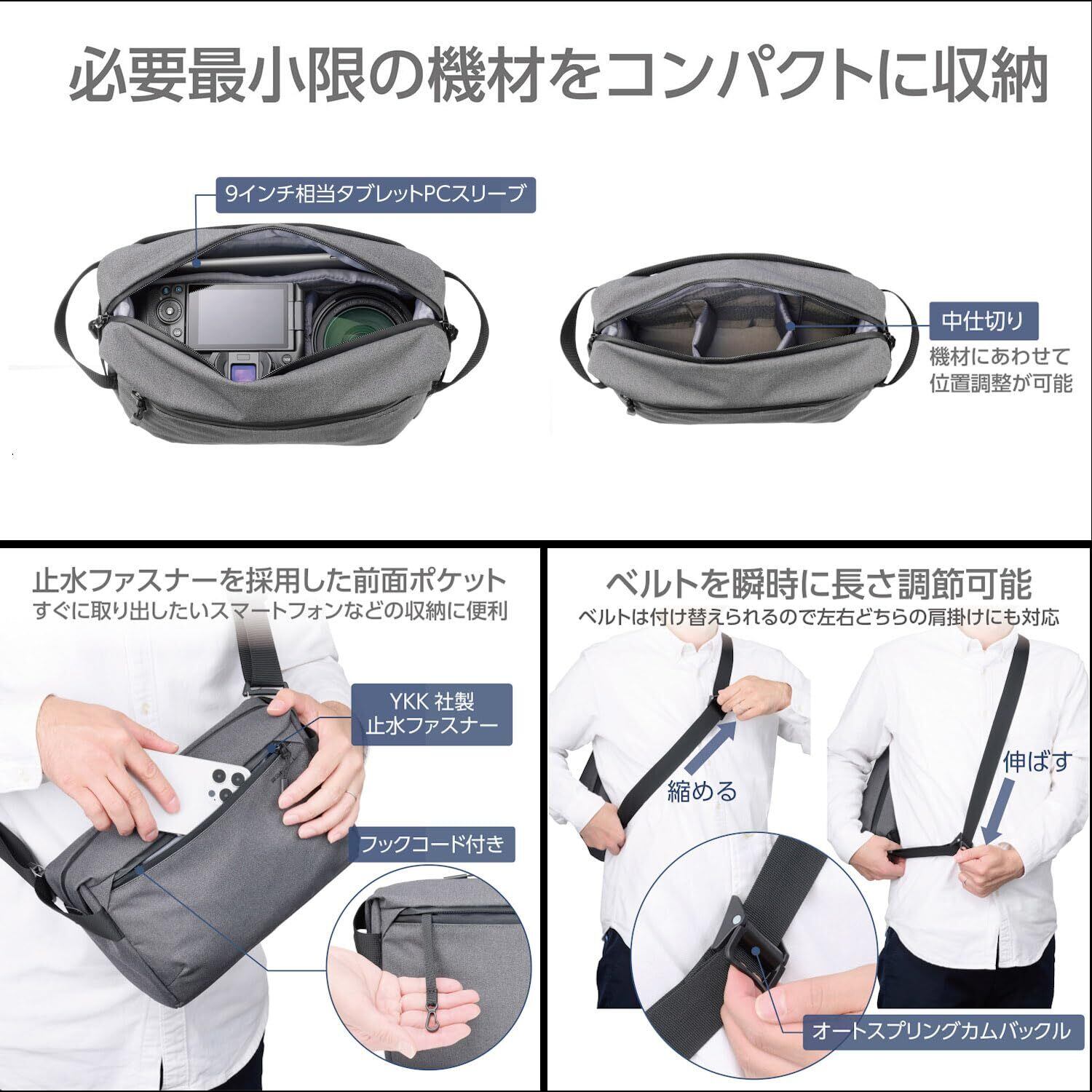 コンパクトなボディに効率よくカメラが収納可能なミニマルデザイン。街歩きでの気軽な撮影にちょうどいいスリングタイプのカメラバッグ。