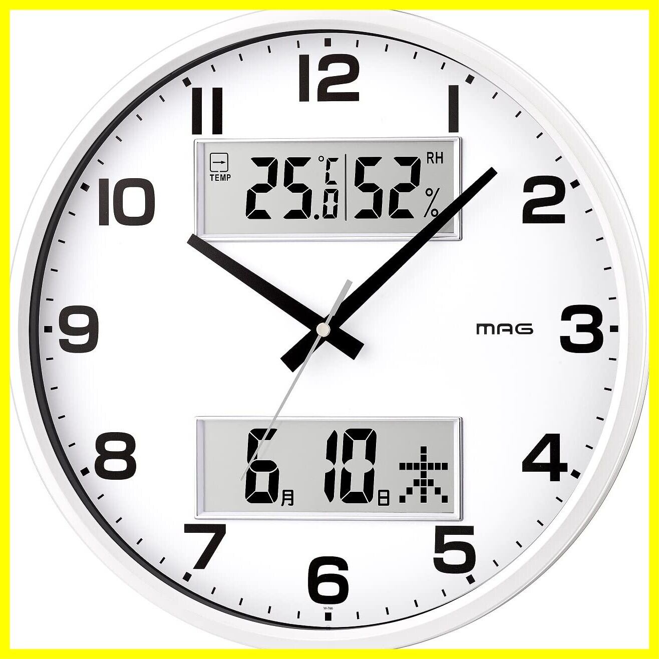 ●日常生活に便利な温度・湿度・日付・曜日のデジタル表示機能が付いたアナログ表示の掛け時計