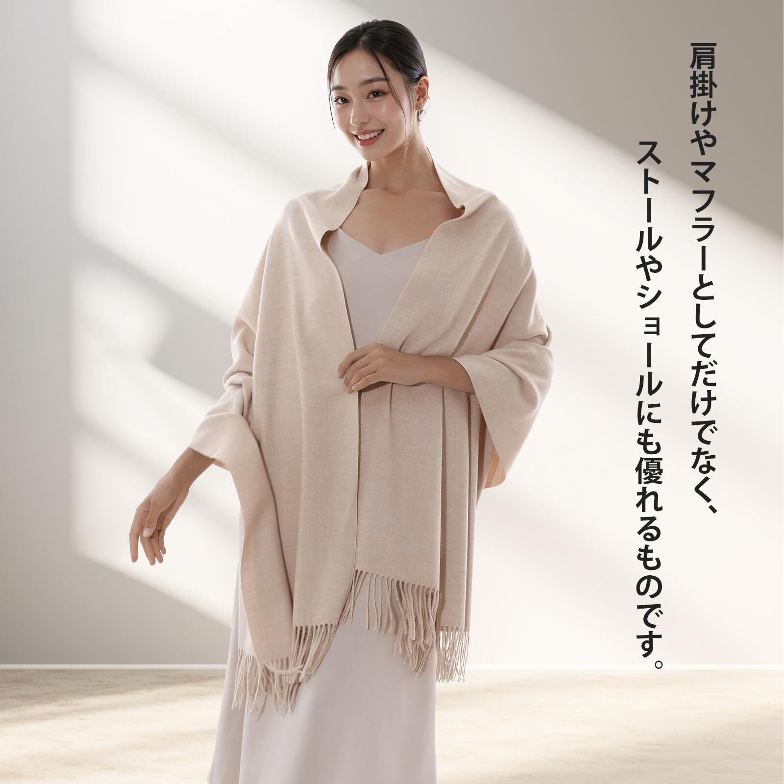 巻アレンジはもちろん、羽織りにも膝掛けにも使える。カシミヤタッチなので、ウールが苦手な方にもオススメ