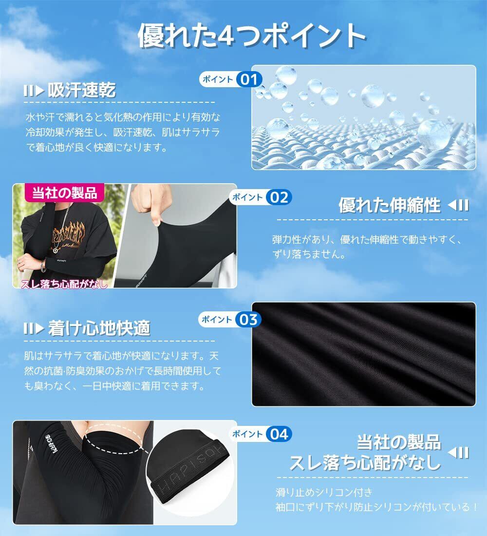 ❄【アームカバー 瞬間接触冷感−5℃を実現】肌に生地が触れた瞬時に、ヒンヤリとした冷感が持続します。接触冷感で夏でも、肌の熱を生地が吸い取ってくれるので、触った時に冷たく感じます。