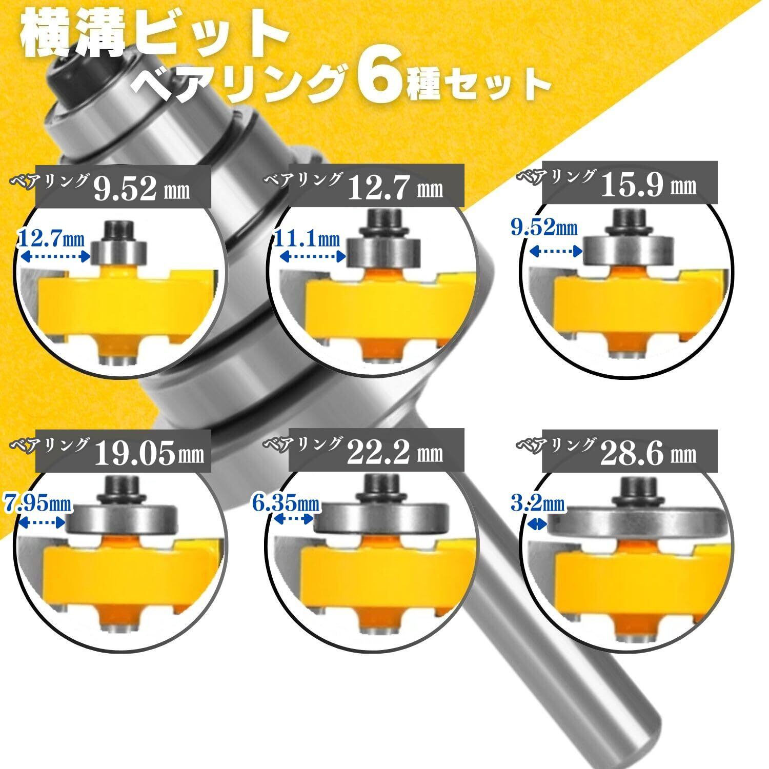 商品概要 : シャンク径6㎜ 6種類のベアリングで溝彫りの深さを調整できます。段欠きにも。
