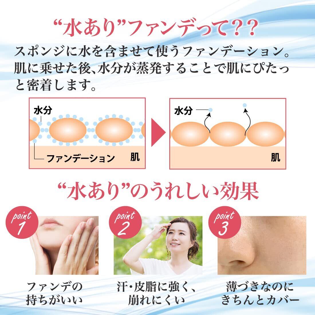 商品特長 スポンジに水を含ませて使うファンデーション。肌に乗せたあとは、水分が蒸発することでぴたっと密着。