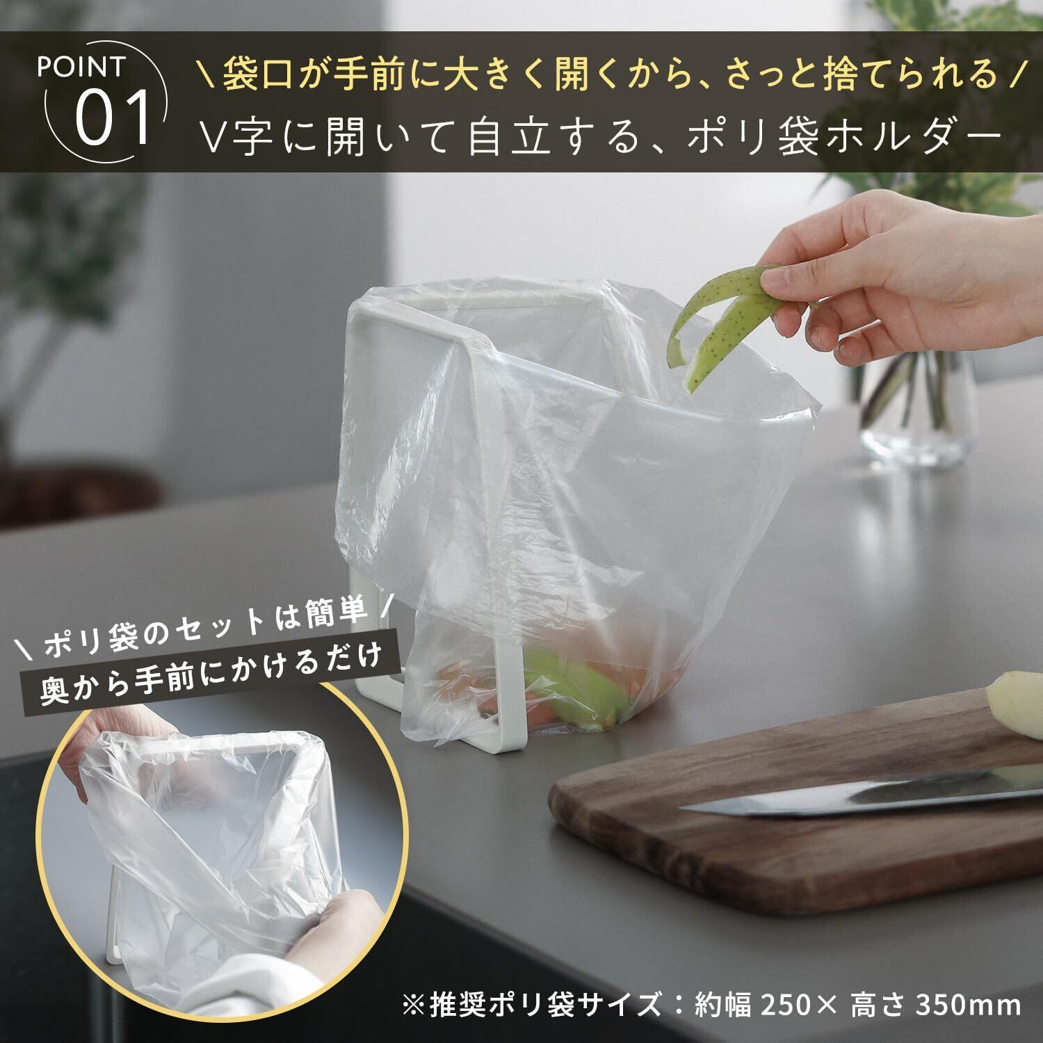 【袋口が大きく開いて捨てやすい】ポリ袋を奥から手前にかけるだけで簡単にセットできます。袋口が大きく開くのでゴミが捨てやすいです。※推奨ポリ袋サイズ:約幅250×高さ350mm