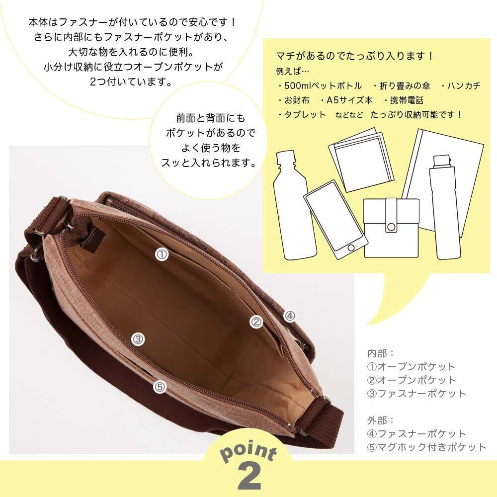 【多彩なポケットたっぷり収納】メイン収納は、たっぷりとしたマチ巾12cmも有るので大きめの持ち物もお弁当箱もスッキリ収納。前後2つのポケット(前面ファスナー付きポケット、背面マグネットホック開閉ポケット)前後に用途に合わせた使い分け整理して入れられ便利、内部には(ファスナー付きポケット、オープンポケット×2)鍵や貴重品、スマートホンと整理して入れられるのでお道具箱の様です。[本体]縦24cm×天巾27cm~底巾22cm×マチ巾天口5cm~底巾12cm[ショルダー]125cm~63cm(調整可)[重さ]300g