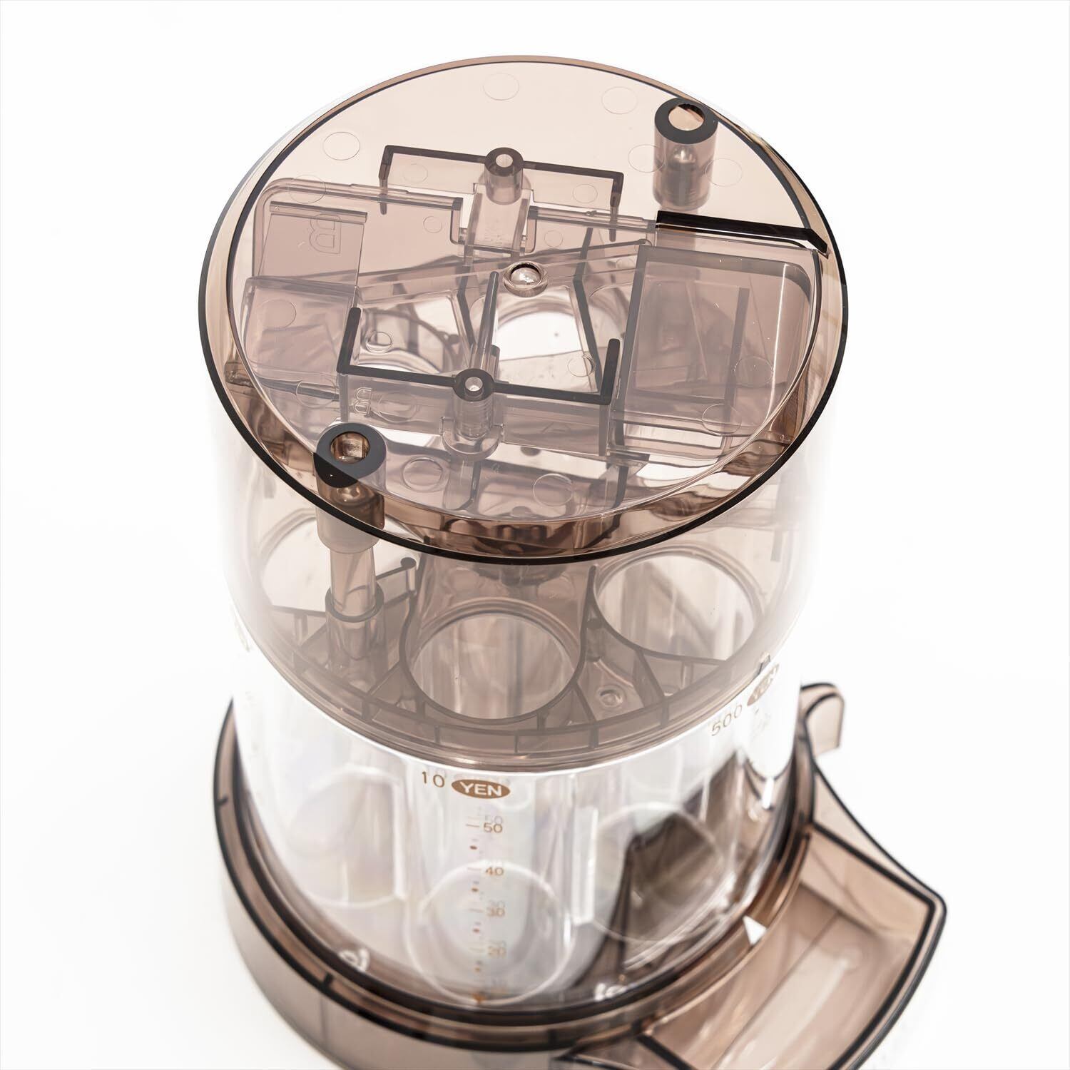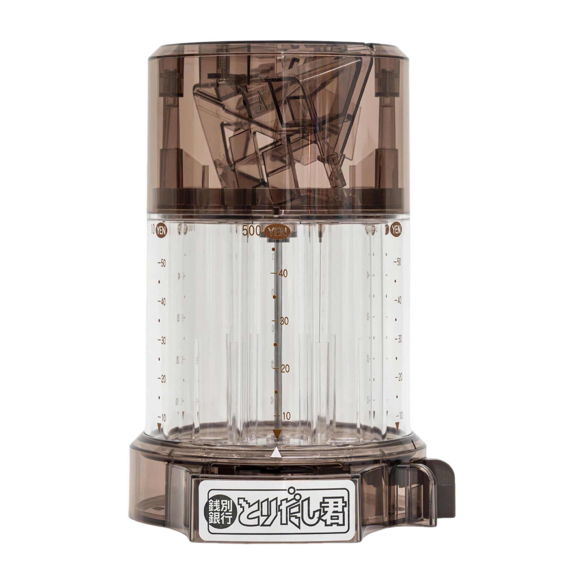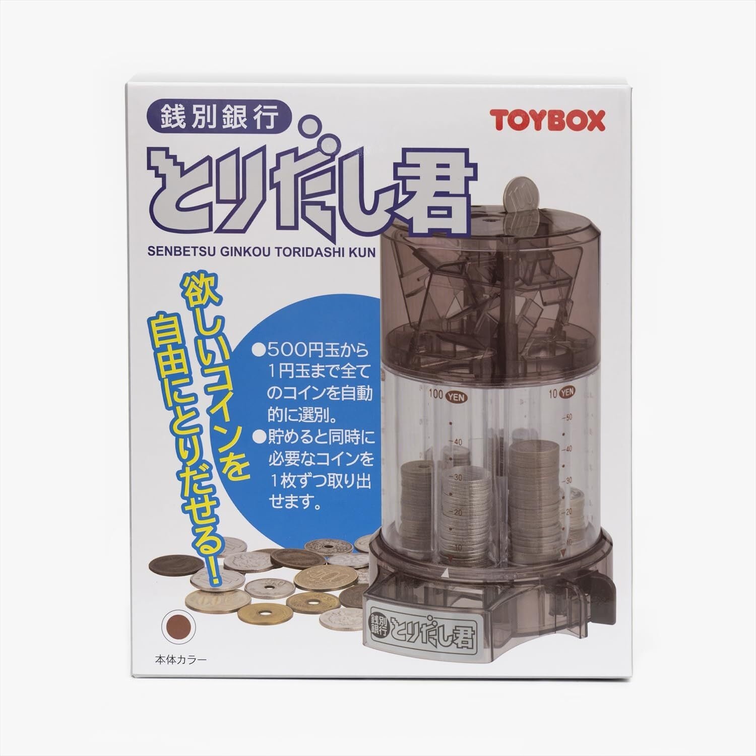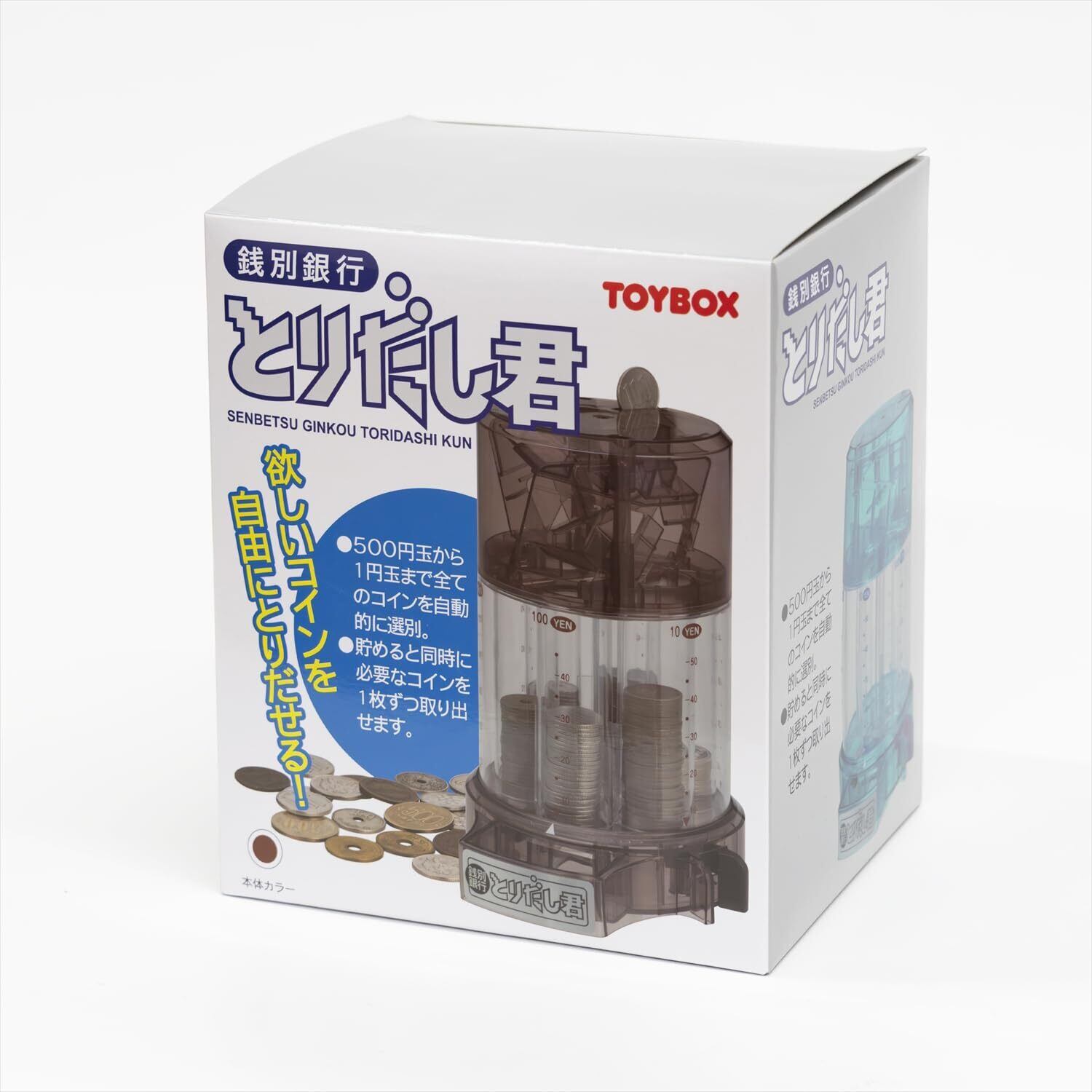 500円玉から1円玉まですべてのコインを自動選別する貯金箱。貯めると同時に、必要なコインを1枚ずつ取り出すことができる取り出しレバー付き。各種類のコインをそれぞれ40枚程度貯めることができる。