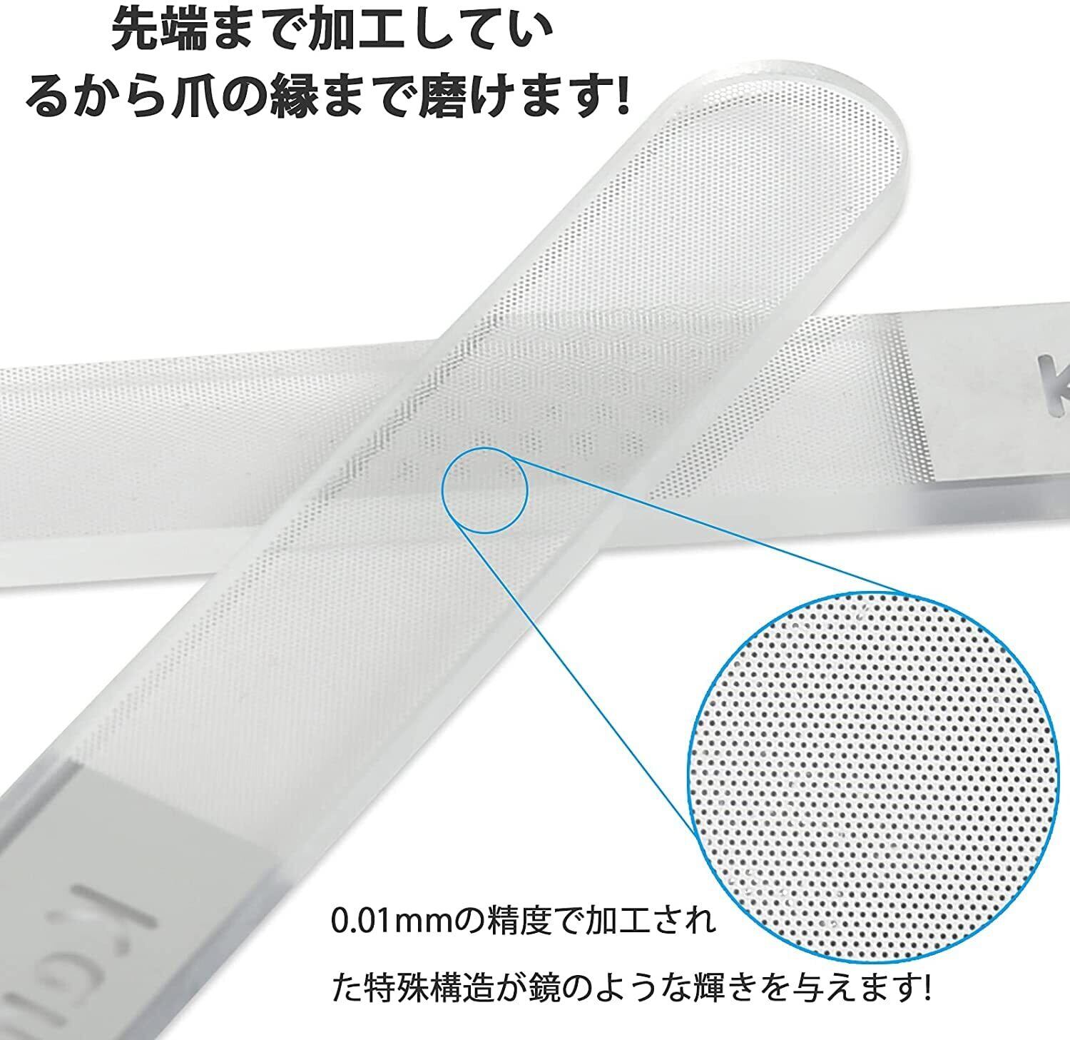【0.01mmの特殊レーザー加工ガラス】従来のツメヤスリやバッファーと違い、0.01mm単位の精度でガラス素材を加工しているので、 短い時間でより美しく 磨き上げてくれるんです! しかもお手入れも簡単で、流水で丸洗いして乾かすだけでOK! 「ガラスって割れそうでやだな」と思われたあなた、 専用ケースも付属ですので保管も安心です。