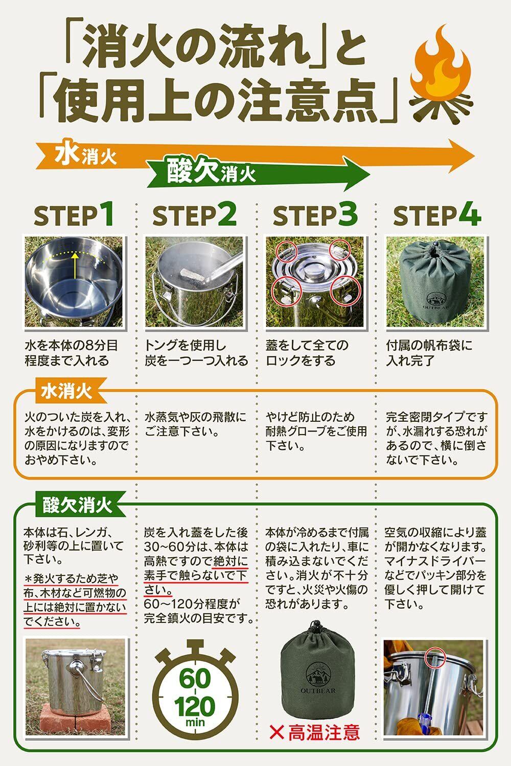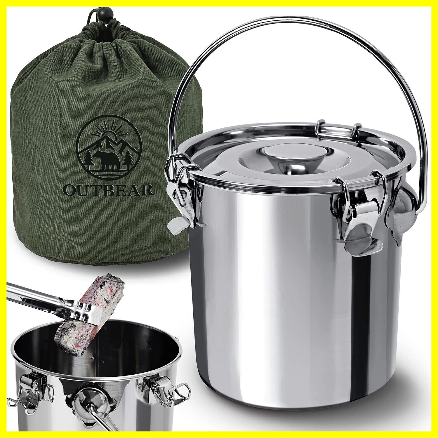 OUTBEAR【秒速消火】 火消し壺 ステンレス 帆布袋付き (2通りの消火方法) 火消しつぼ 炭 炭壺 薪 消火 キャンプ 焚き火 [日本国内検品済]