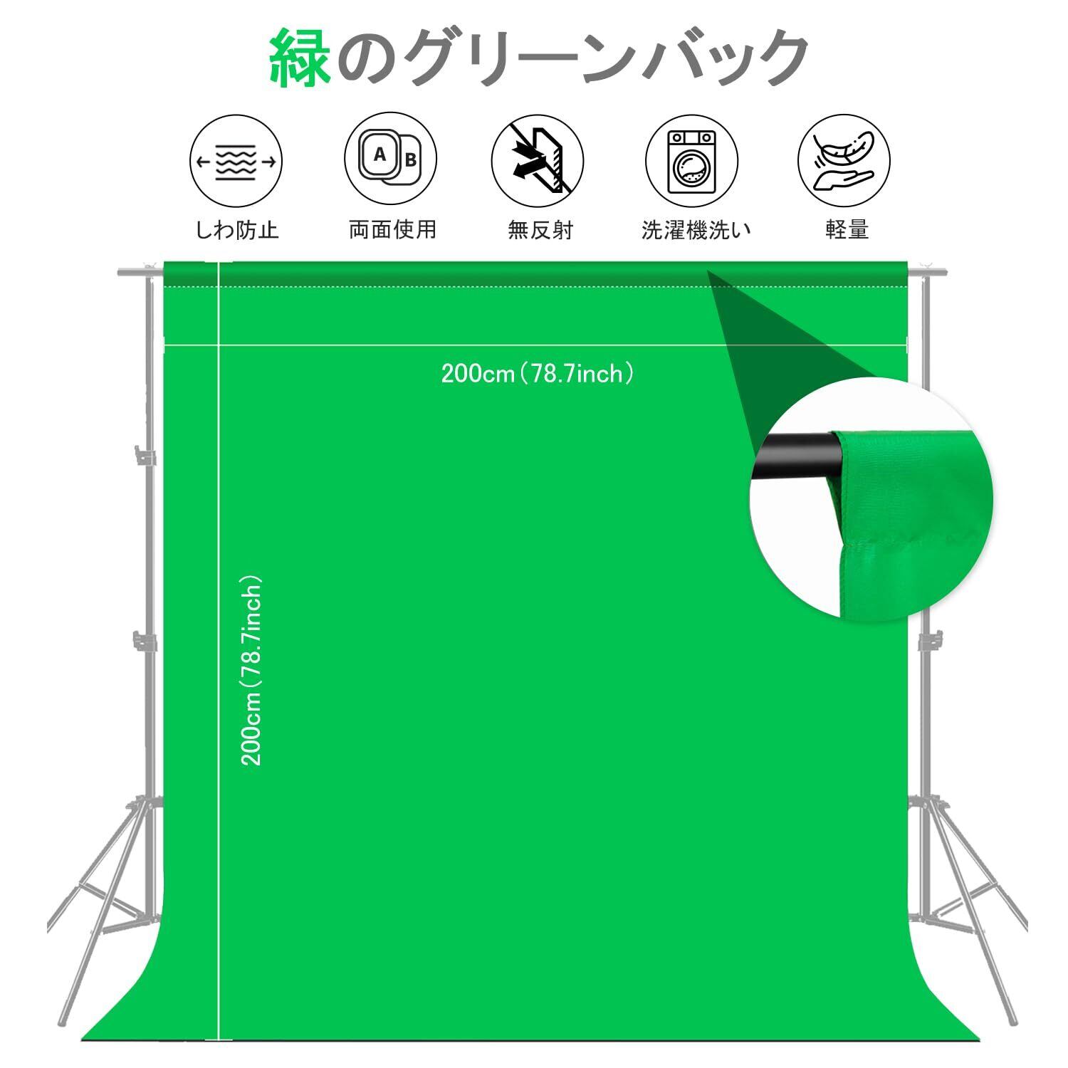 PULUZ グリーンバック 2×2m背景布 緑 グリーンスクリーン 袋縫い 撮影用バックペーパー green screen 厚手ポリエステル綿素材 撮影 背景 洗濯可能 3つ強力クリップ付き オンライン会議zoom用/クロマキー合成/バーチャル背景/リモート背景/全身写真用 (緑, 2×2m)