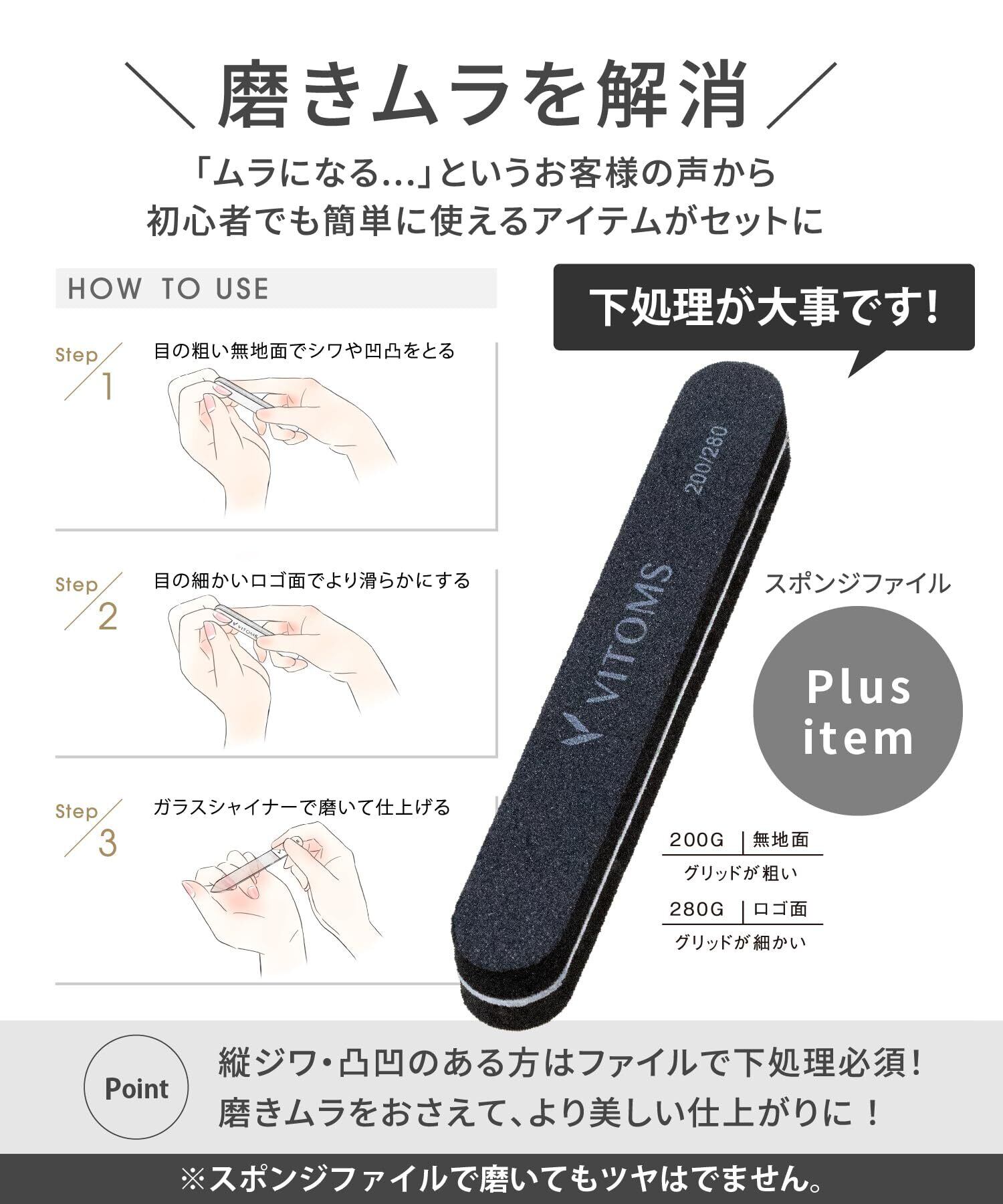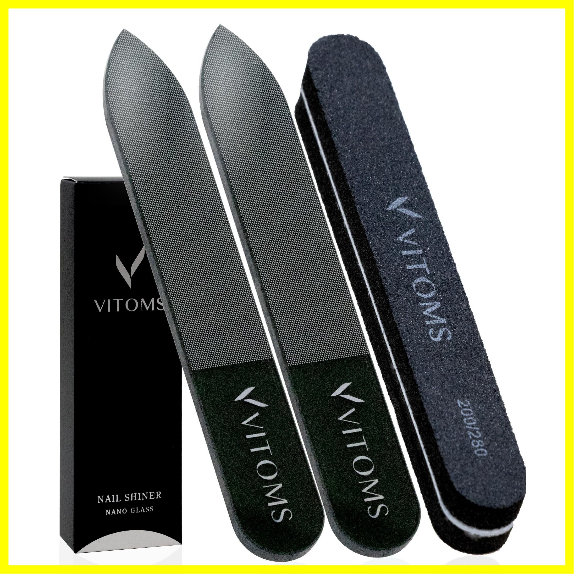VITOMS 爪やすり 爪磨き 2本セット【プロネイリスト推薦】 磨きムラ解消 スポンジファイルセット つめやすり つめみがき つや出し ガラス製 ネイルケア (解説動画付) ブラック,ストレート ギフト プレゼント
