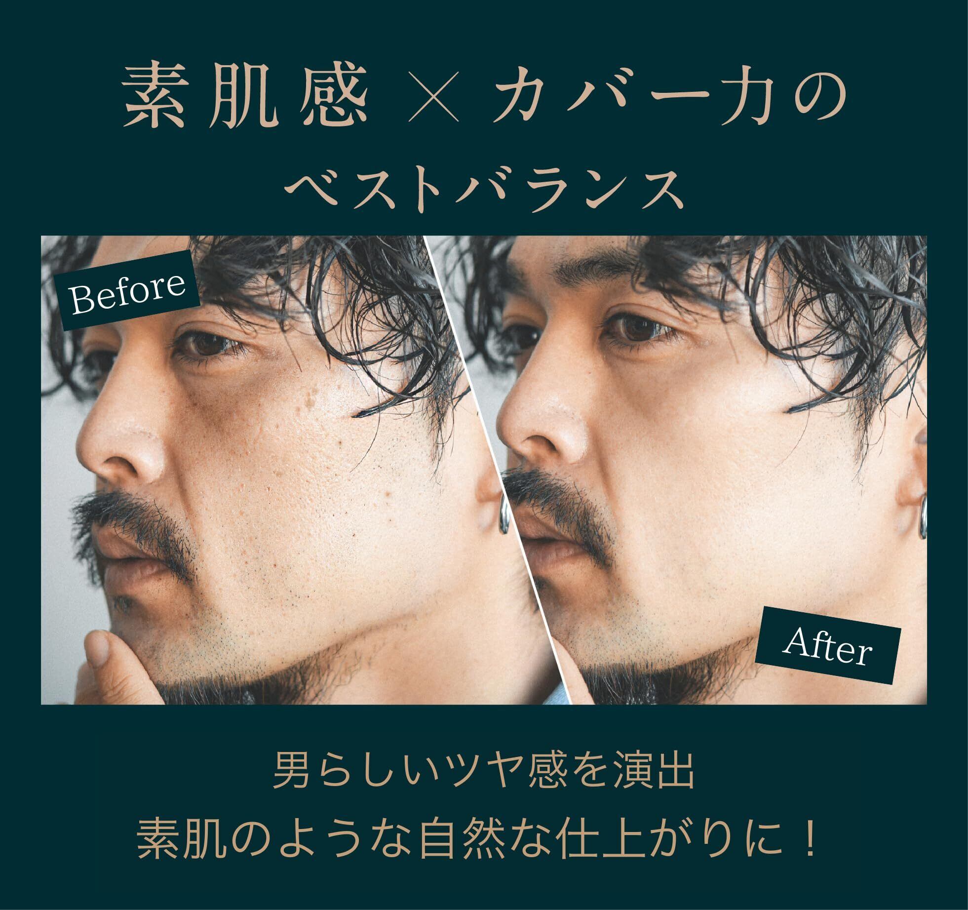 【ナチュラルさ×カバー力のベストバランスを追求】 スキンケアの延長のような使い心地で、素肌を最大限活かす処方発想。自然さと、肌補正力のベストバランスを追求しました。青ひげ・毛穴・シミなどメンズ特有の肌トラブルをカバー(メーキャップ効果による)しながらも、メイクバレしないBBクリームです。