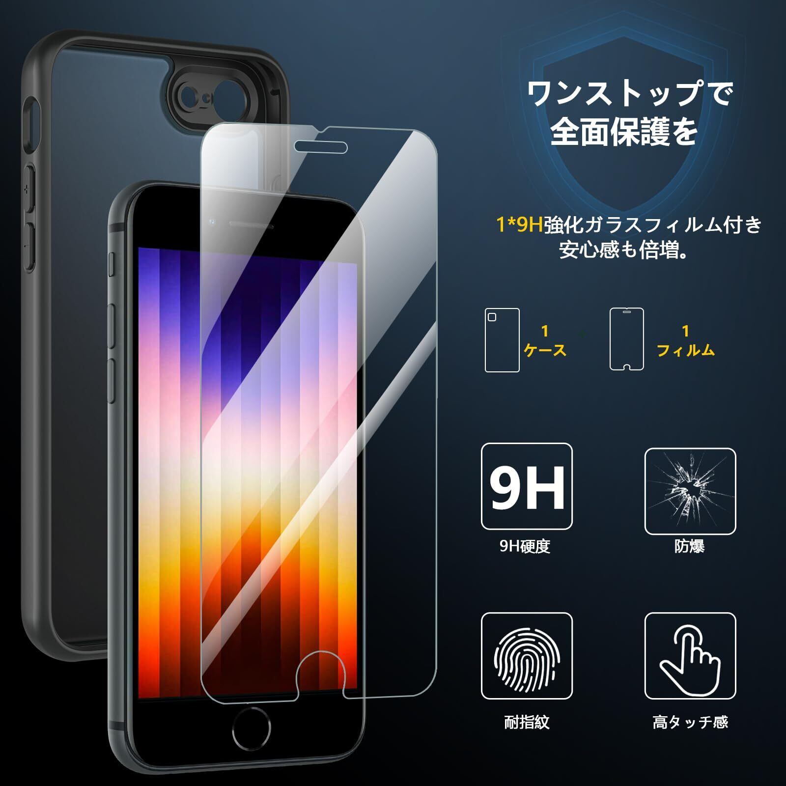 OWKEY iPhone SE ケース iPhone SE3 ケース iPhone SE2 ケース iPhone8 ケース【ガラスフィルム付き】半透明 薄型 軽量 アイフォンse スマホケース 米軍MIL規格 全面保護 耐衝撃 レンズ保護 iPhone7ケース ストラップホール 黄ばみなし 耐久性 iPhone SE2/SE3/8/7 用ケース 4.7インチ ブラック