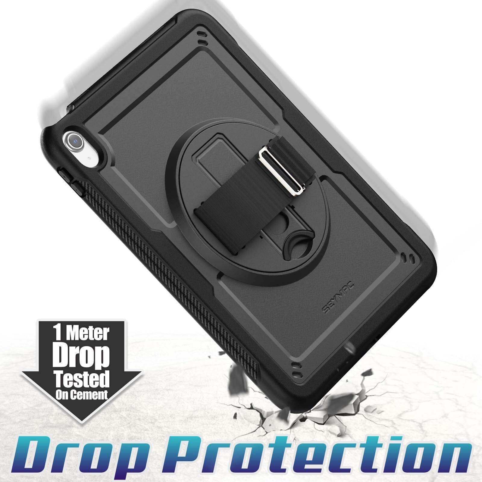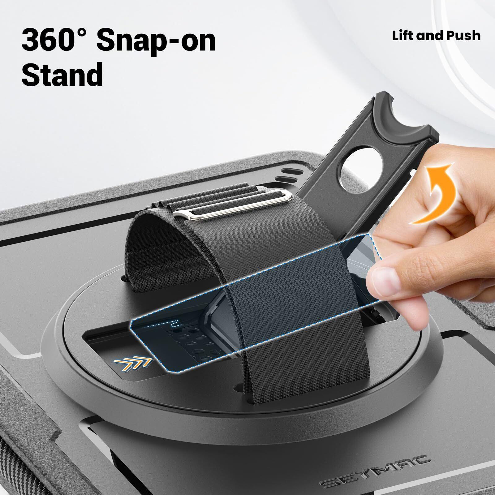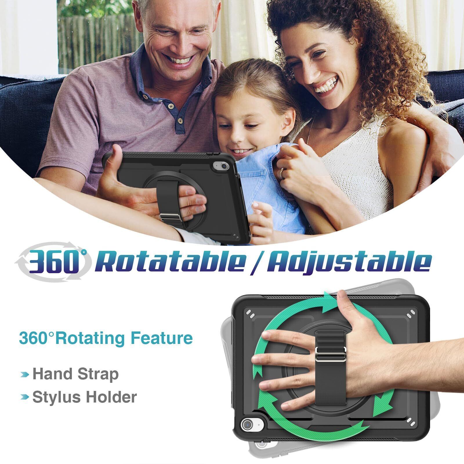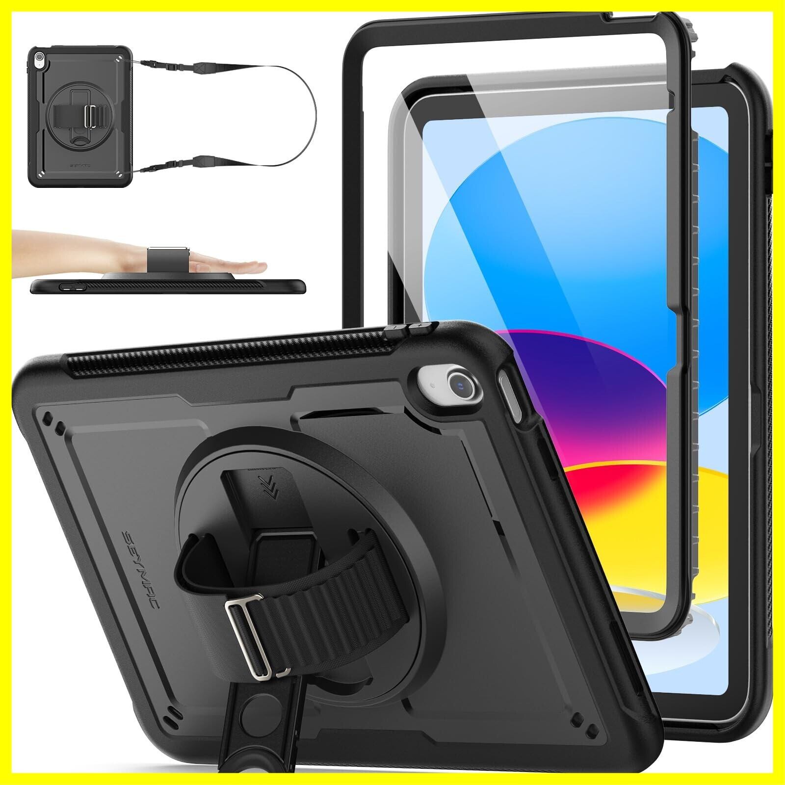 SEYMAC stock iPad A16 第11世代11インチ/第10世代10.9インチ専用ケース 耐衝撃 Gフック式ハンドストラップ 360°回転スタンド ペン収納 ショルダーストラップ フィルム付き前面フレーム 全面保護カバー (ブラック)