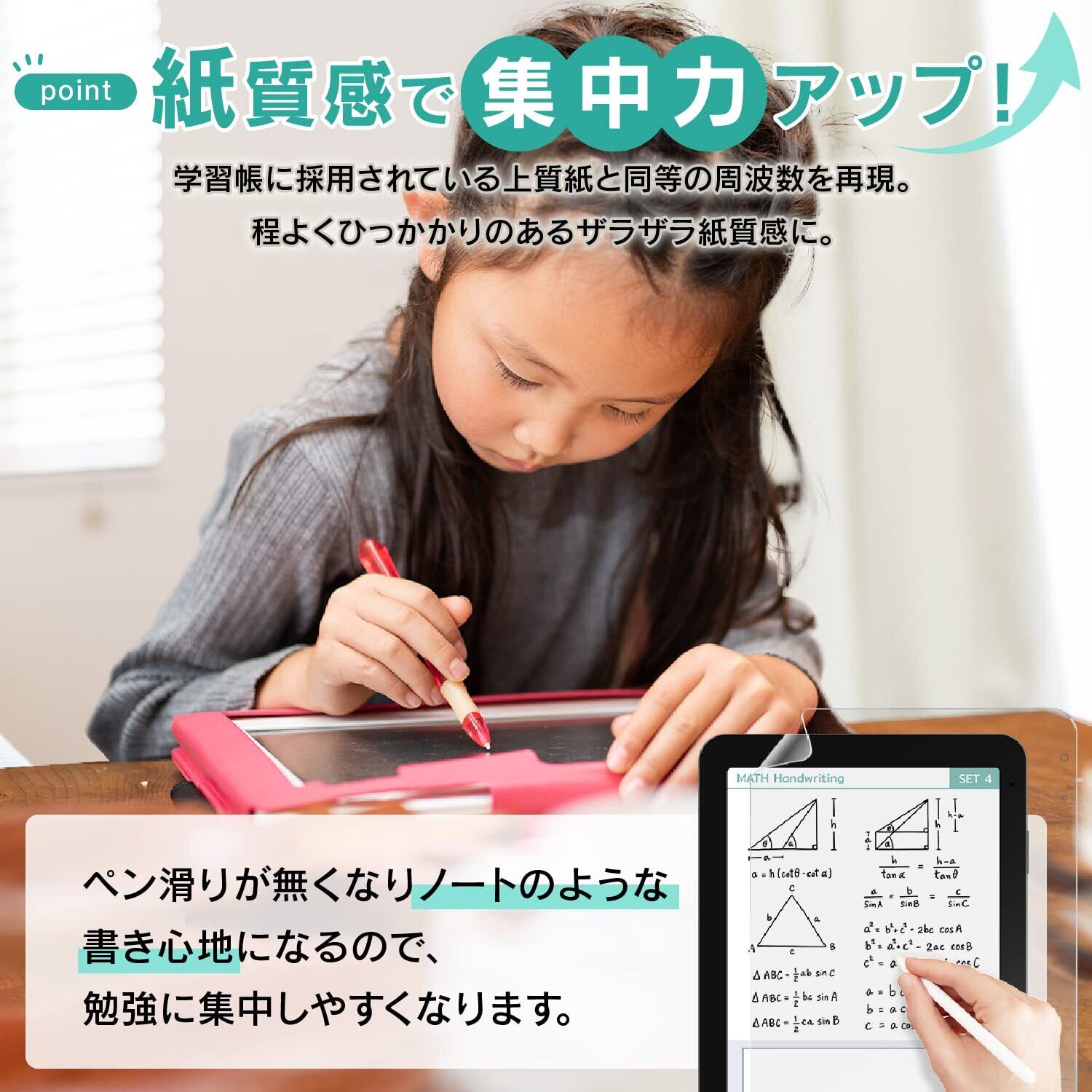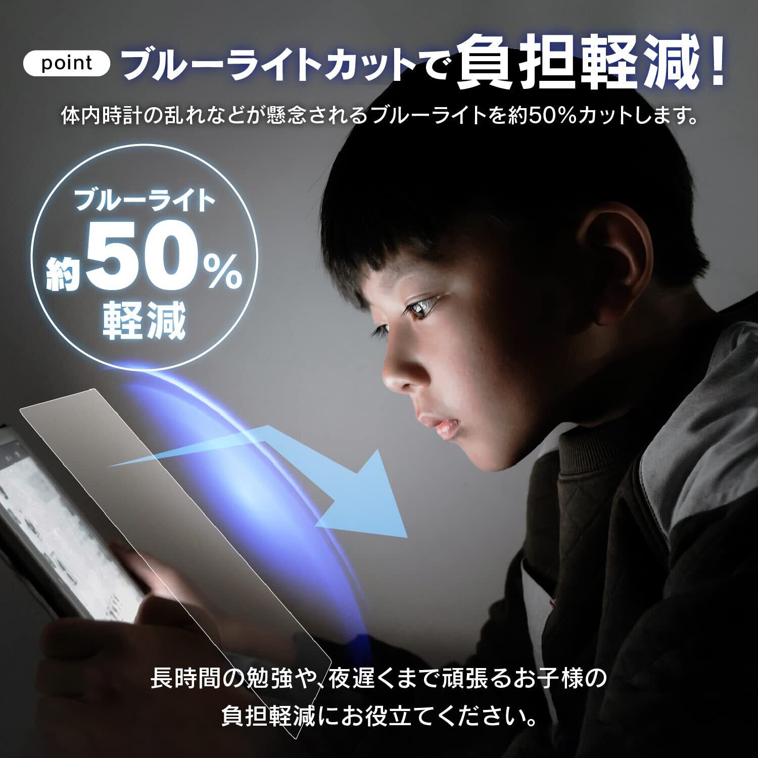 ▶▶【ブルーライトカット】体内時計の乱れなどが懸念されるブルーライトを約50%カットします。長時間の勉強や、夜遅くまで頑張るお子様の負担軽減にお役立てください。▶▶【傷防止】フィルムの表面硬度は3Hとなっていますので、カバンに入れた際のすり傷などから画面を保護します。▶▶【耐久性】500gの負荷をかけたスタイラスペンでの耐擦傷性試験にて、5000回の試験を行っても品質の劣化は認められませんでした。