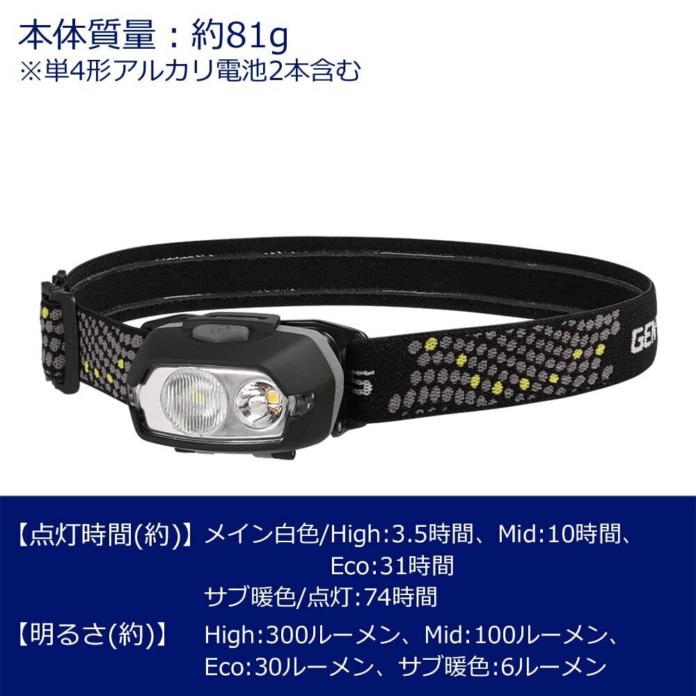 明るさ:High/300ルーメン・Mid/100ルーメン・Eco/30ルーメン、サブ暖色LED/6ルーメン、使用電池:単4形アルカリ電池×2本