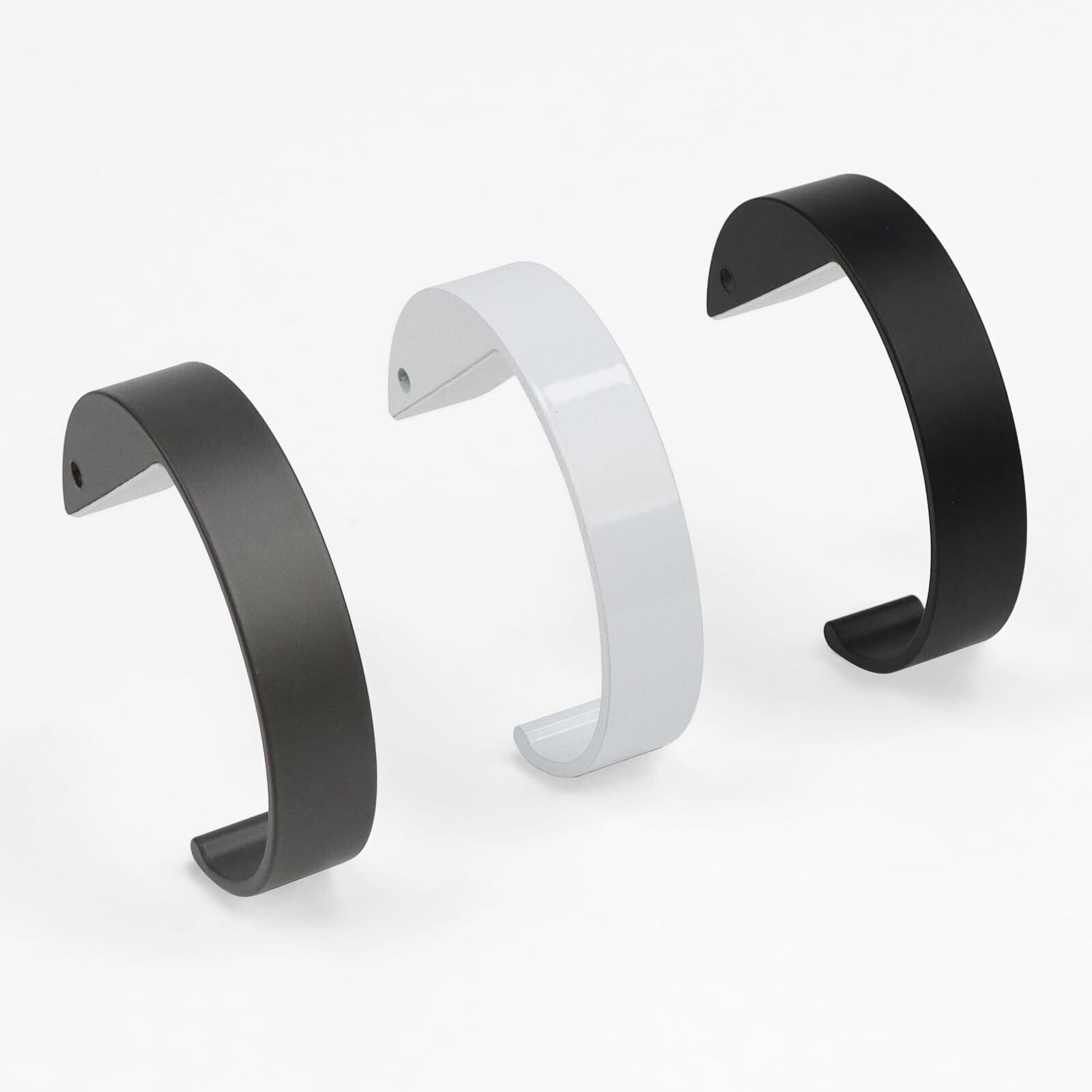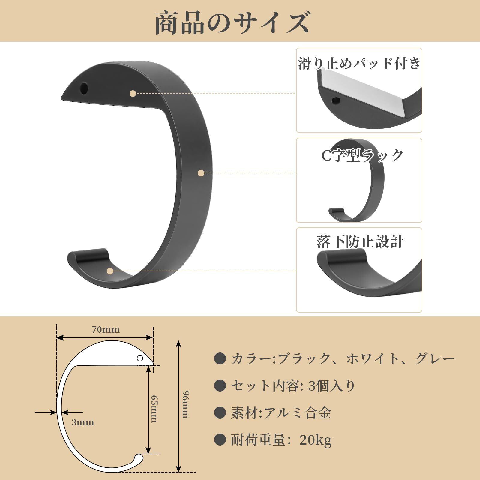 【デスクフックの詳細】パッケージ内容:C型フック3色入り;カラー:ブラック、ホワイト、グレー。サイズ:(約) (長さ)9.6cm×(幅)7cm×(厚さ)2cm、重さ:(約)65g;高品質の 合金材料を選択する。軽量で、安定性もあり、耐荷重:20kg。最大7cmまでの厚みのテーブルに取り付け可能