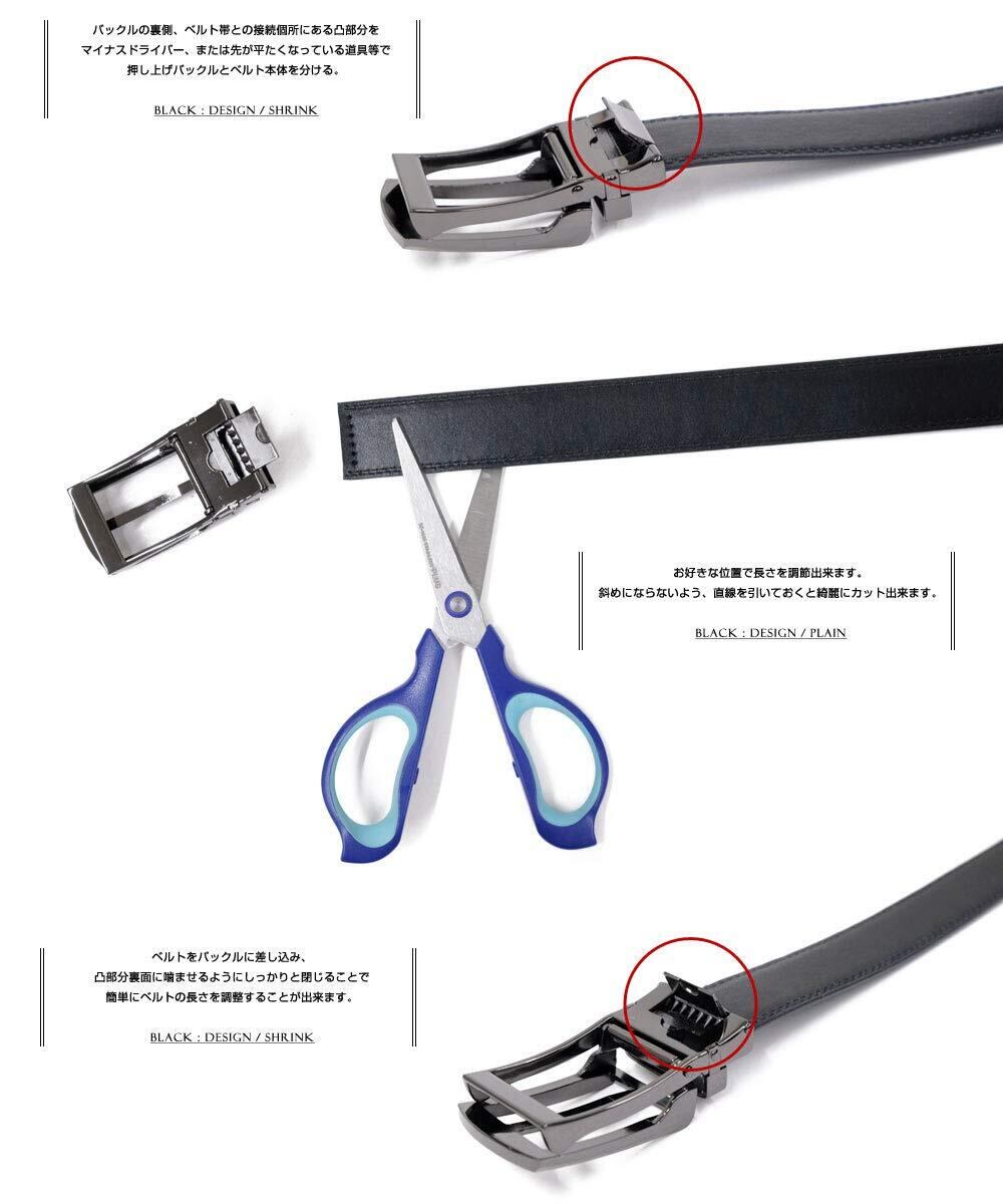 【簡単⾧さ調節可能】ベルトの裏に間隔約5mmの溝(レール)があるので締まり具合を微調整できます。ベルトの裏に溝(レール)があり、その部分をバックルで挟み込みロックするという仕組みです。 取り外す際はバックルを持ち上げる事で、ロックが簡単に解除されます。 穴がない事によって固定点周辺の革がヘタレないのが嬉しいポイント。 耐久性も安心頂けます。またバックルをはずし、帯をハサミでカットする事によって簡単にサイズを調整可能です。