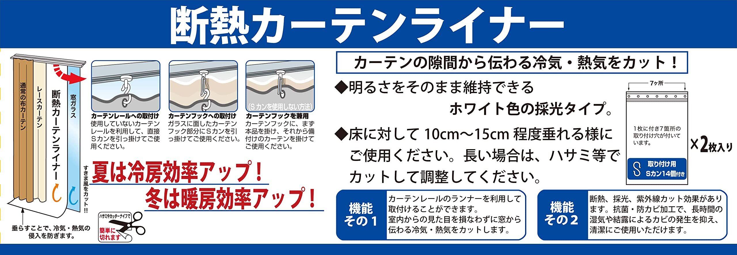 ■窓から伝わる冷気・熱気をカット 窓から伝わる冷気や熱気をカットするので、お部屋の冷暖房効率を上げることができます。季節を問わず年中使えるので、省エネ効果も期待ができます。■安心の抗菌・防カビ・UVカット加工 抗菌・防カビ加工を処理しているので、いつでも安心です。またUVカット加工も処理されているので、家具や床の日焼けを防ぎます。■カーテンレールに取り付けるだけでOK 既にご使用されているカーテンレールを使って取り付けるだけでOKなので、すぐにご使用いただけます。■約10~18cm程度、床に垂らしてご使用ください。