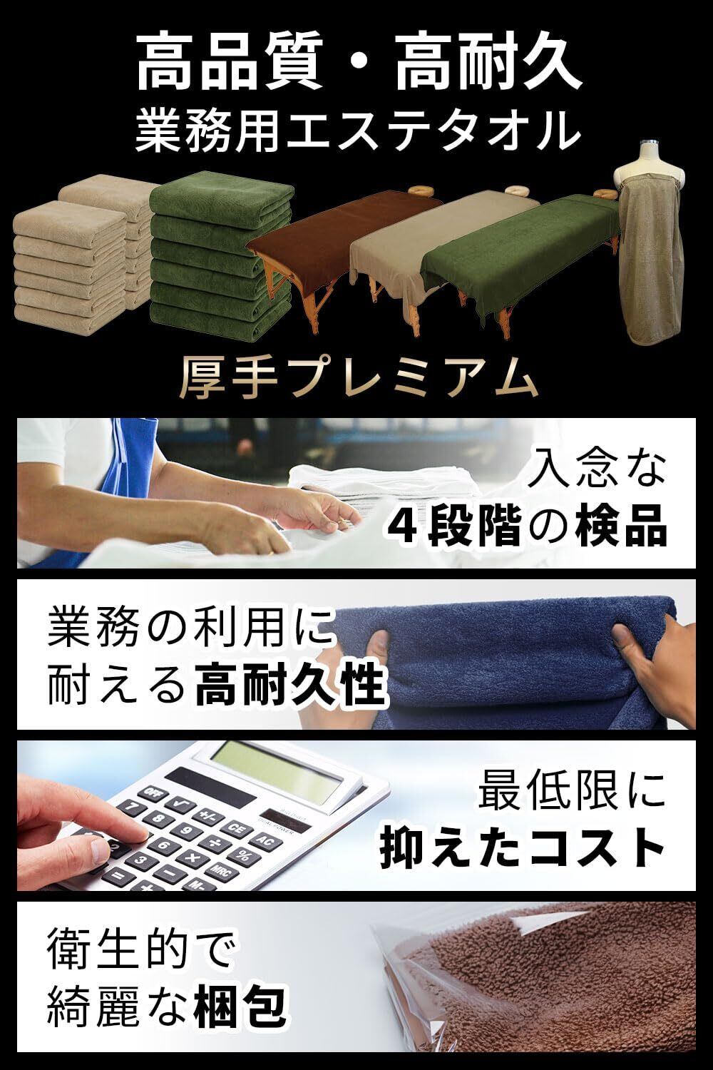 【 エステサロン・整体院・マッサージ・リラクゼーションサロン等に最適な業務用タオル 】 ■ サロン様のご要望を基に改良し、よりエステサロンに最適なタオルに仕上がりました。 ■ しっかりした重さ・厚さで吸水性と速乾性に優れており、大判であるので余裕を持って全身を拭く事が出来ます。生地がしっかりしているので、業務用タオルとして最も適しております。