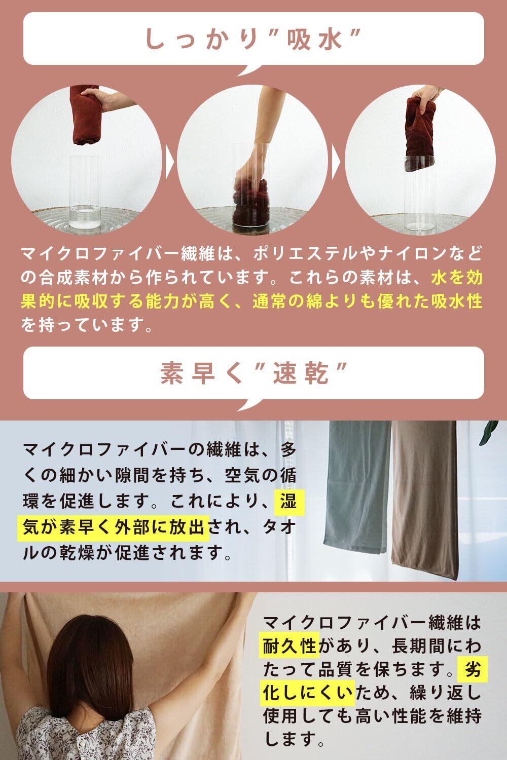 【 優れた速乾性・耐久性 】 ■ 速乾性に優れているので、洗濯後に室内で干すだけで素早く乾きます。これにより、いつでも清潔で快適な状態を保つことができます。 ■ マイクロファイバーは耐久性があるため、何度も使用しても品質が劣化しにくく、長くご利用いただけるのでコスト面でもお得です。