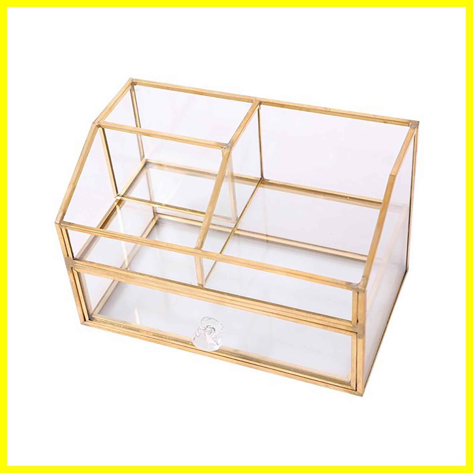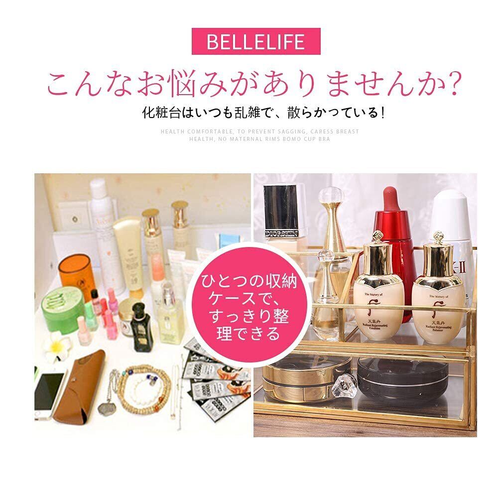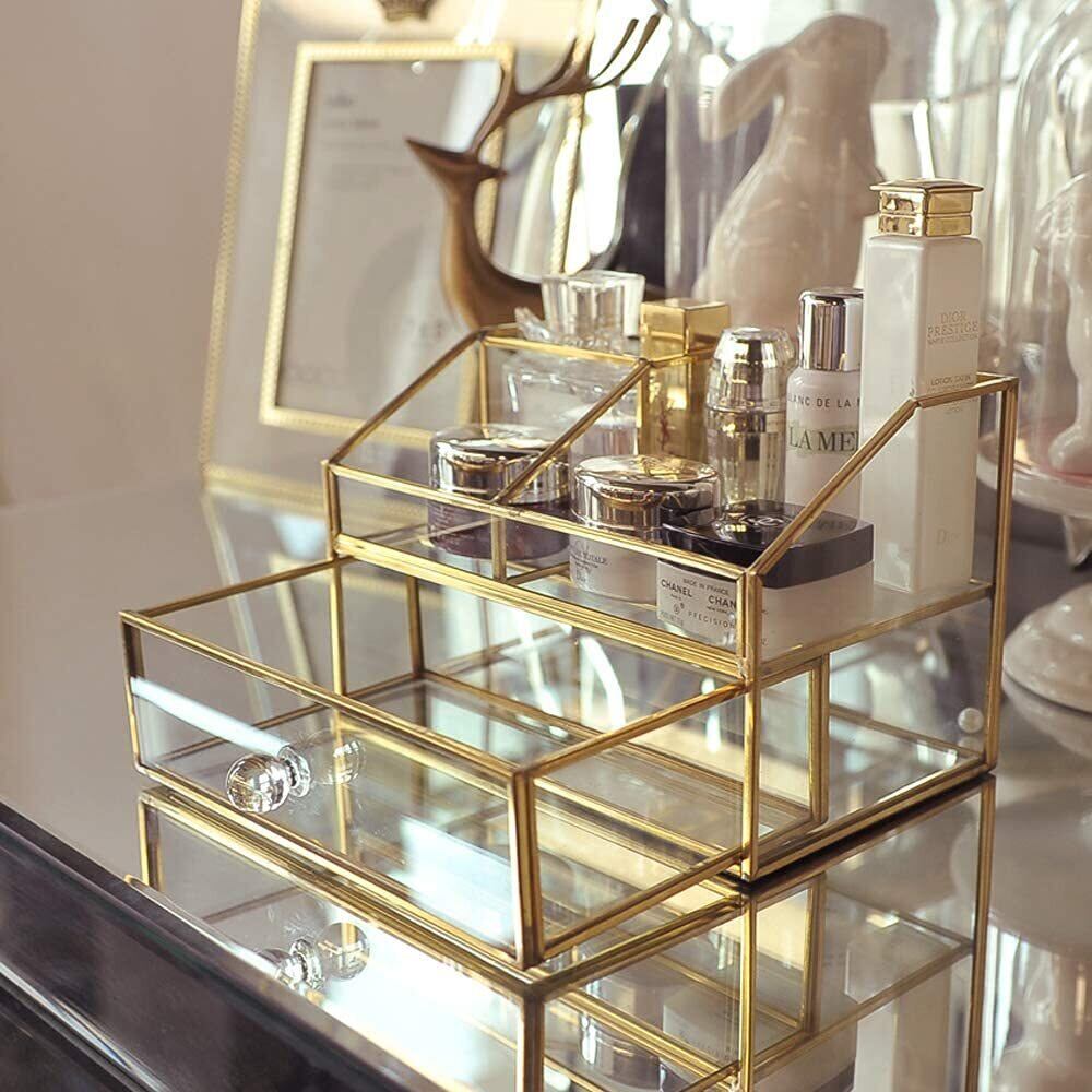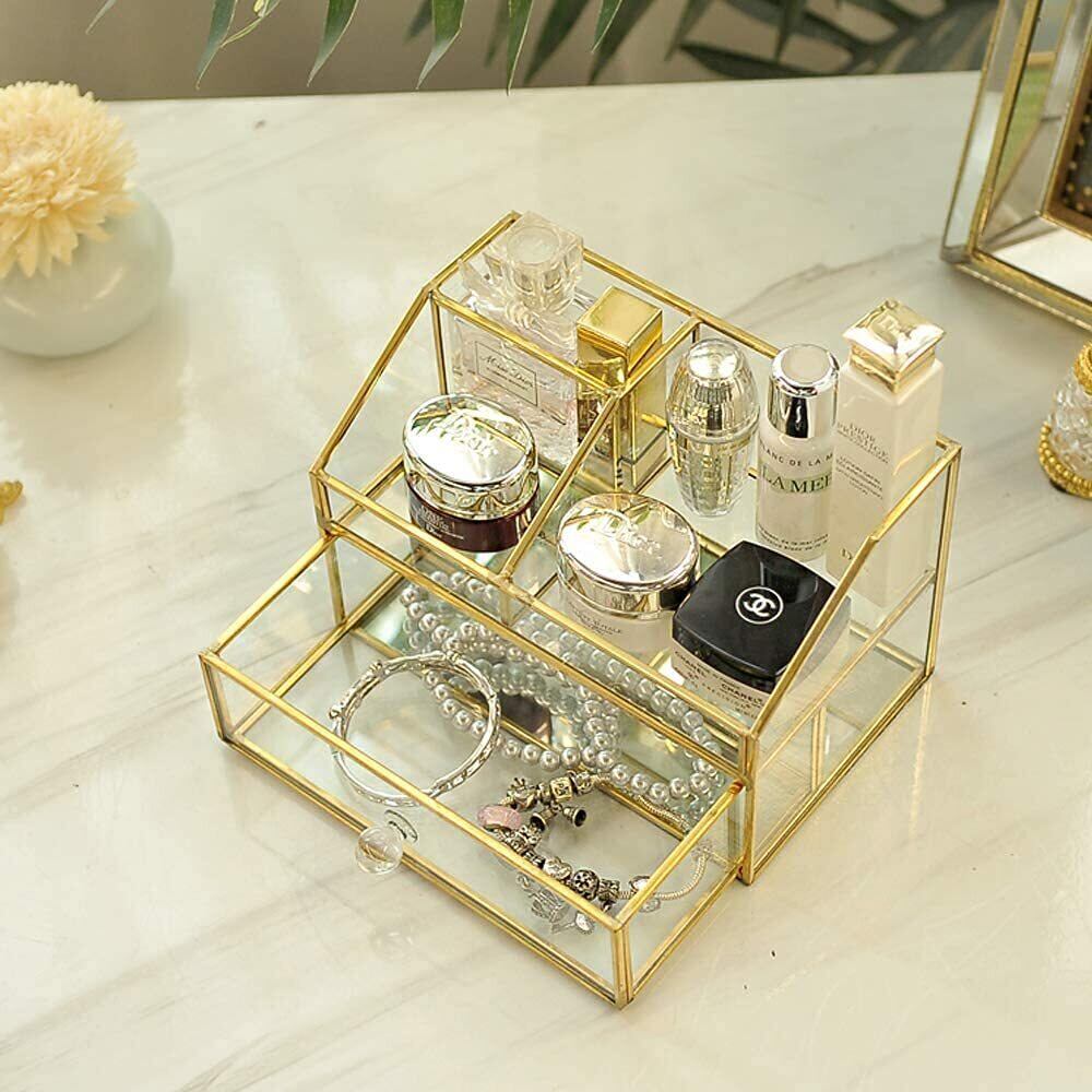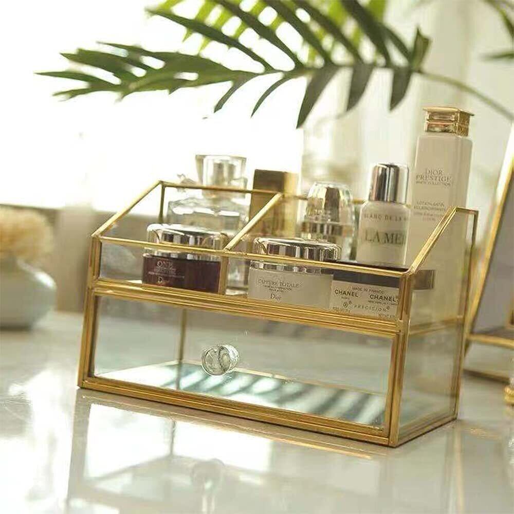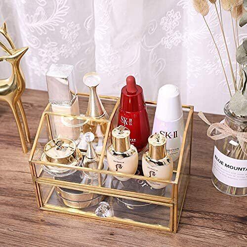 BelleLife コスメ収納 メイク収納 小物入れ 化粧品収納ボックス 透明ケース ガラス 真鍮 化粧品収納ラック 耐久性 整理整頓 卓上収納 リップケース 引き出し 化粧品入れ おしゃれ 透明ガラス 化粧品入れ コスメ収納 ネイルジェル収納 メイクボックス 化粧品 スキンケア ブラシ