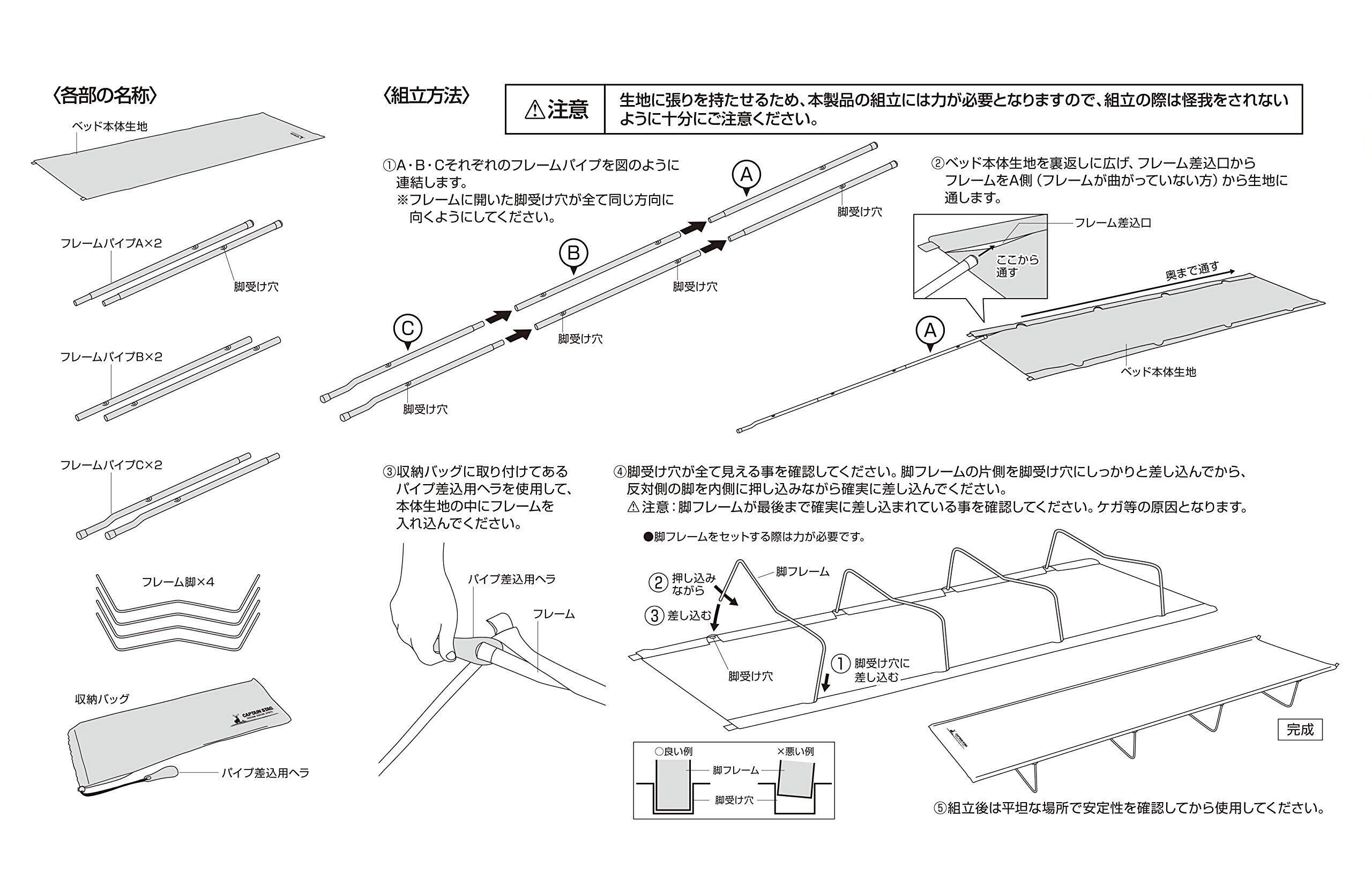 セット内容:ベッド本体生地×1、フレームパイプA×2、フレームパイプB×2、フレームパイプC×2、フレーム脚×4、パイプ差込用ヘラ×1、収納バッグ×1