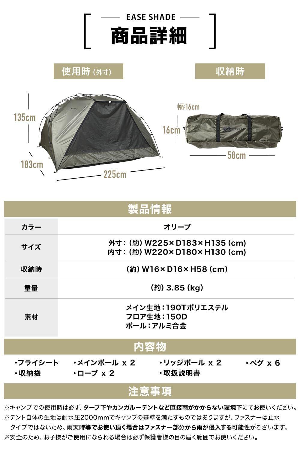 【その他のスペック】アルミニウムポール採用で軽量、コンパクトに。ワンタッチテントや、ポップアップ式と比較しても軽量、コンパクトで荷物のじゃまになりません。WAQのリラクシングマットや、レジャーシートがピッタリハマるサイズ感。組み合わせてお使いいただくのがオススメです。