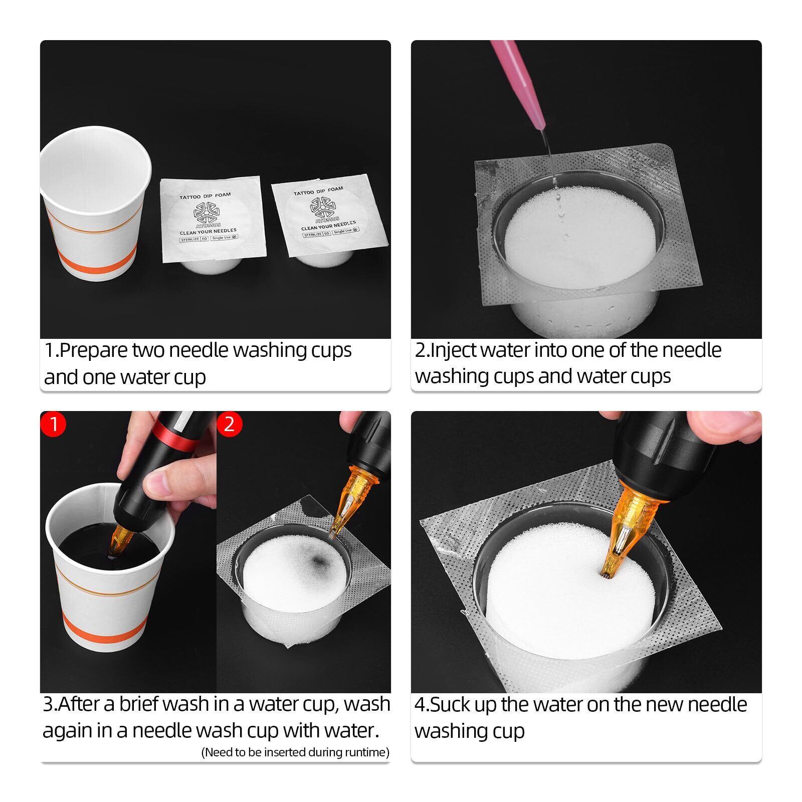 使用方法:スポンジを少量の水に浸し、タトゥーニードルを入れ、そっとスライドさせて拭くだけで、残留物や塊が残りません。