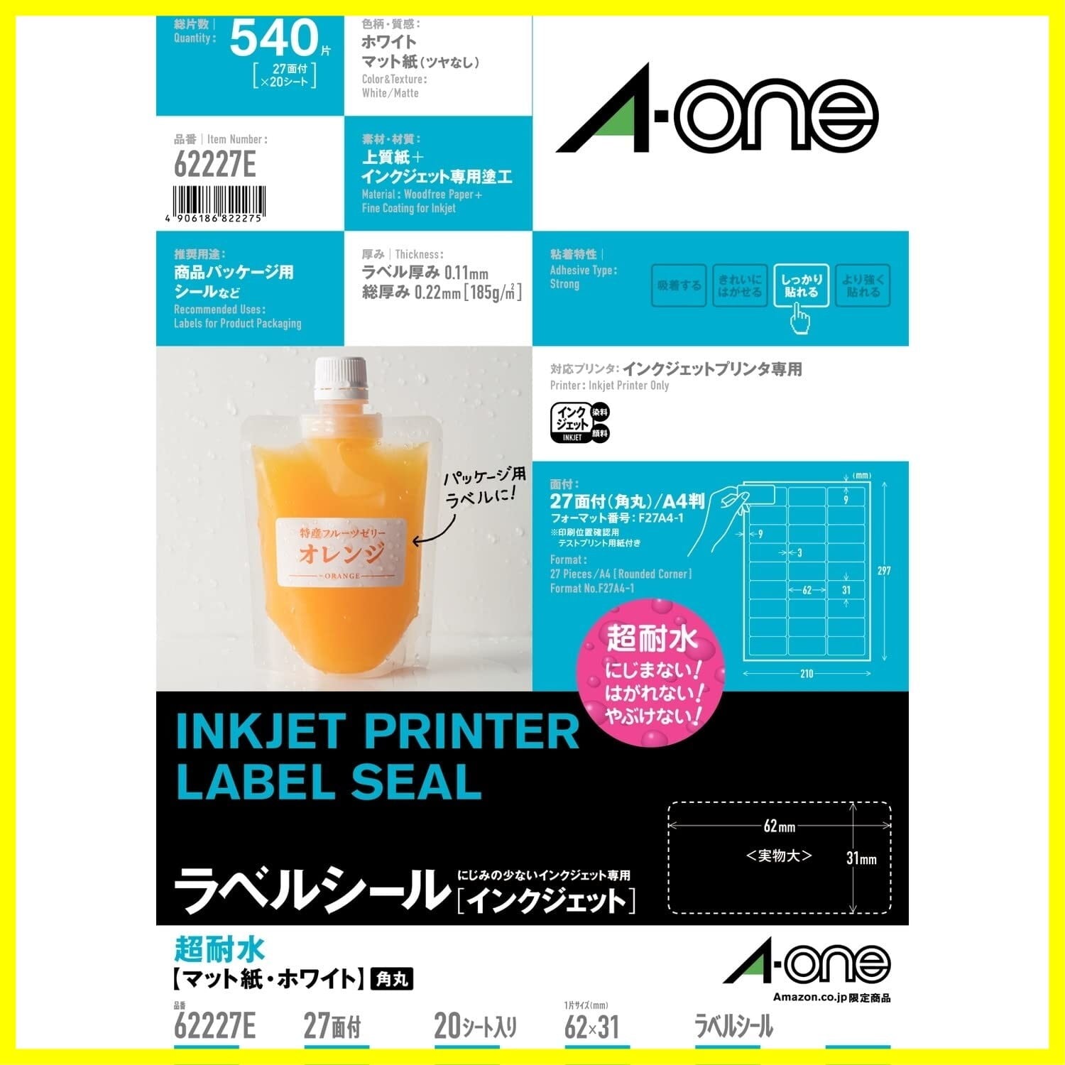 【製品情報】シートサイズ: A4判 (210mm×297mm) / ラベルサイズ: 62x31mm (3列×9段) 27面 / 入り数: 20シート(540枚分) / ラベル厚み: 0.11mm / 対応プリンタ: インクジェット