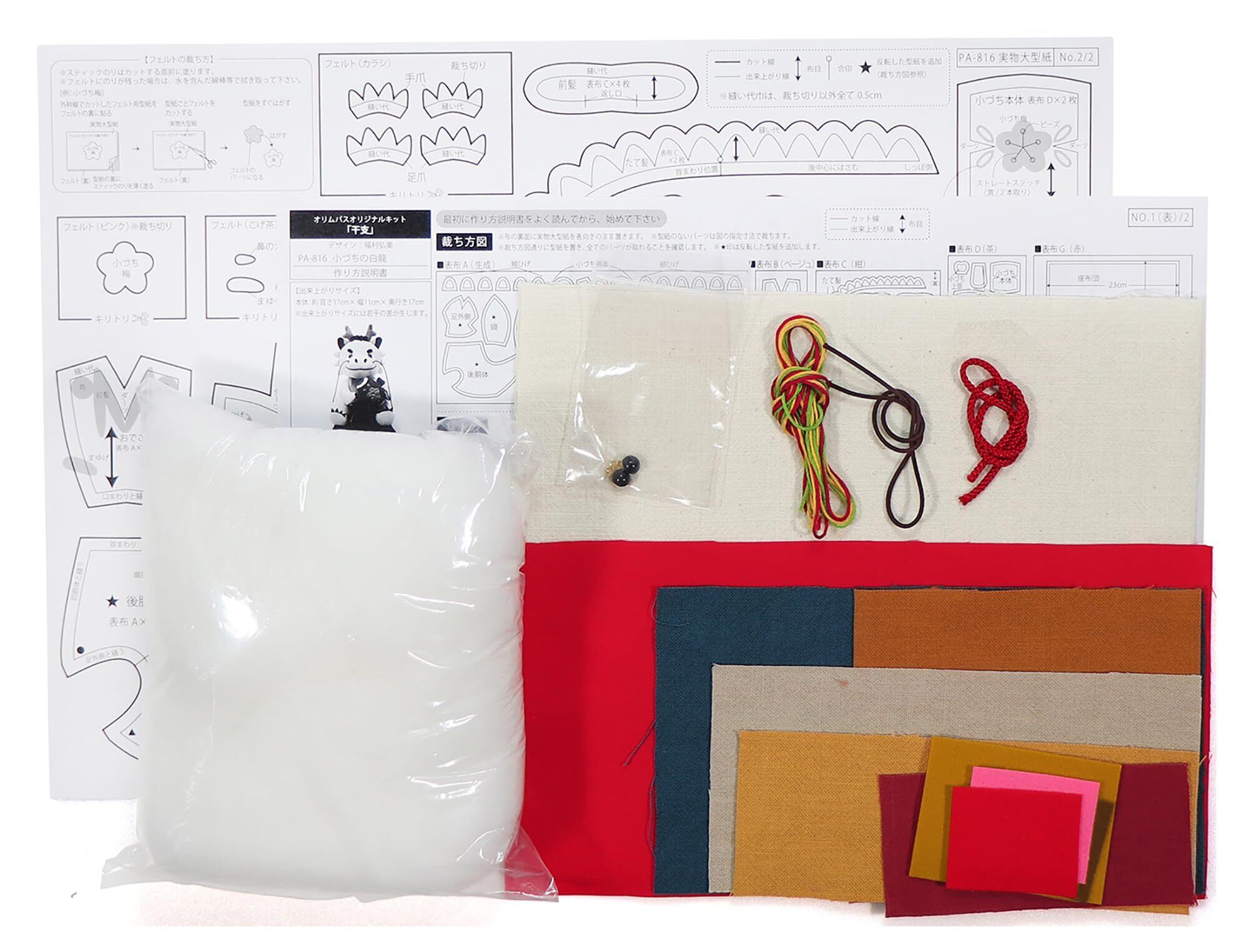 キット内容:布、フェルト、詰め綿、目玉ボタン、ビーズ、紐、ゴム、刺しゅう糸、作り方説明書、実物大型紙