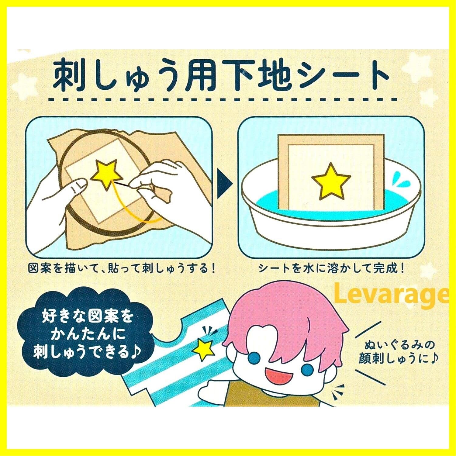 この刺繍用下地シートは、簡単に好きな図案を刺繍するための便利なアイテムです。以下の手順で使用します: 図案を描いて貼る: 刺繍したい図案をシートに描き、それを布に貼ります。このシートは、描いた図案をそのまま刺繍するためのガイドとして役立ちます。 刺繍を行う: シートの上から刺繍を行います。図案に沿って刺繍をすることで、正確で綺麗な刺繍が完成します。 シートを溶かして完成: 刺繍が終わったら、シートを水に溶かします。シートは水に溶ける素材でできているため、刺繍部分だけが残り、シートはきれいに消えます。 このシートを使うことで、ぬいぐるみの顔刺繍や服のデザインなど、様々なアイテムに簡単に刺繍を施すことができます。初心者でも手軽にプロフェッショナルな仕上がりを楽しむことができる便利な商品です。